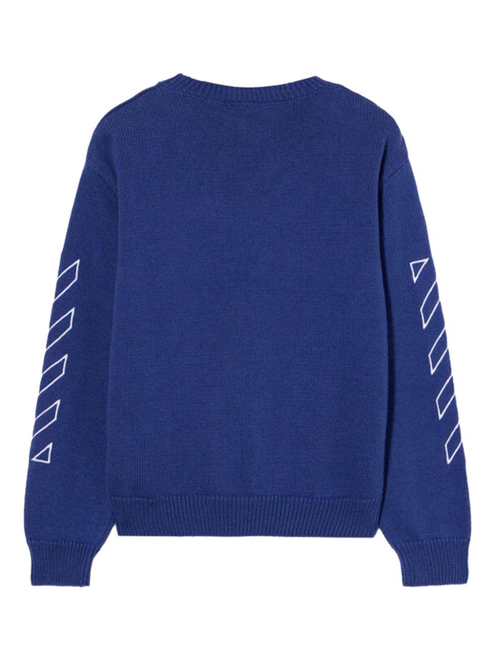 Maglione blu, scollo rotondo, dettaglio maniche a righe diagonali, logo ricamato, polsini a costine, orlo a costine.