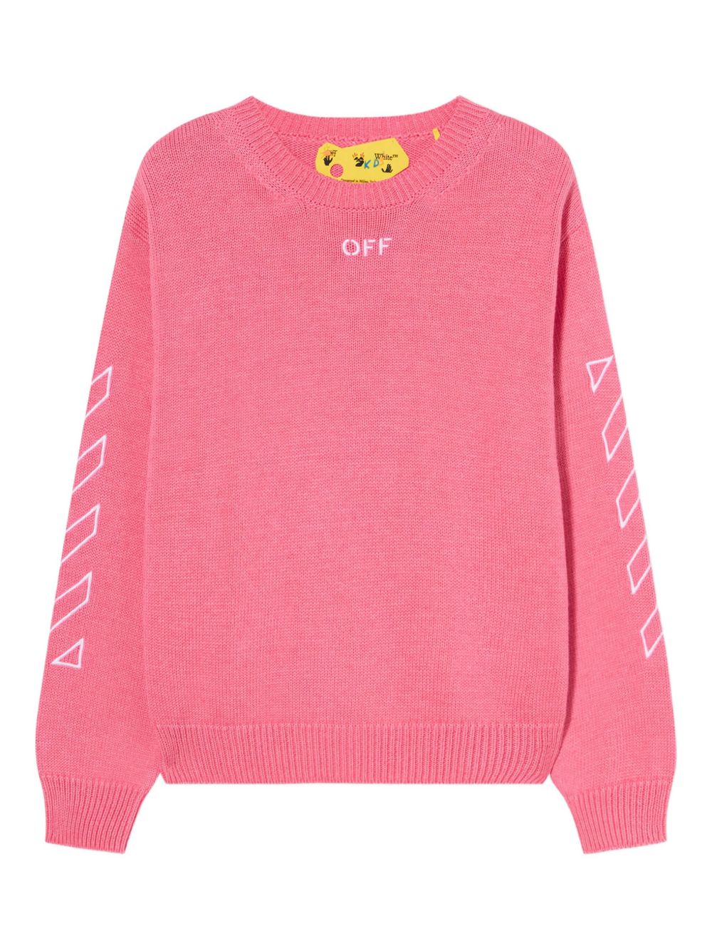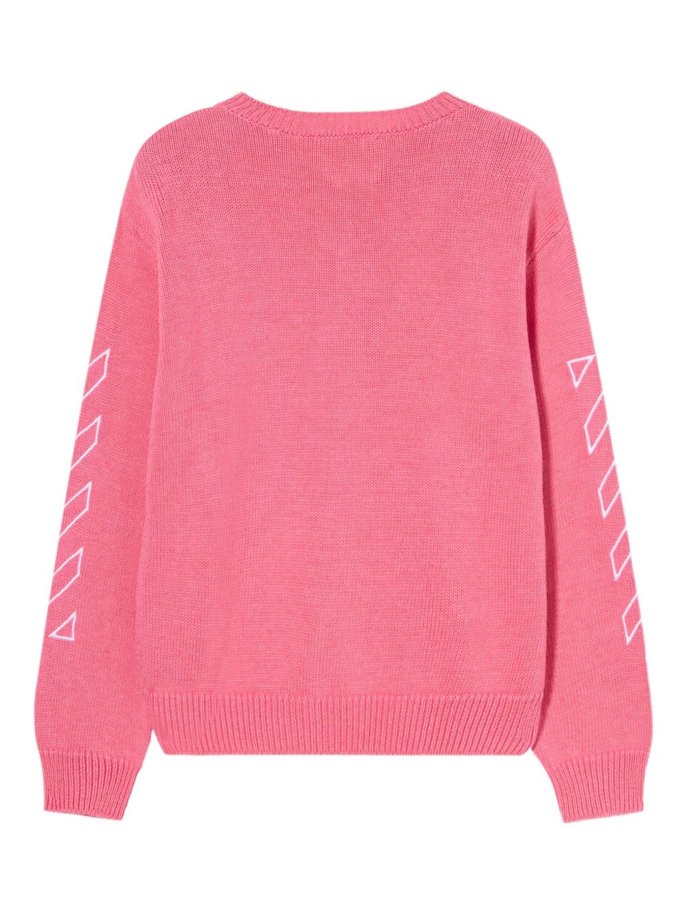 Maglione, lavorazione a maglia ,fucsia, girocollo a coste, stampe geometriche sulle maniche, dettaglio logo, maniche lunghe.
