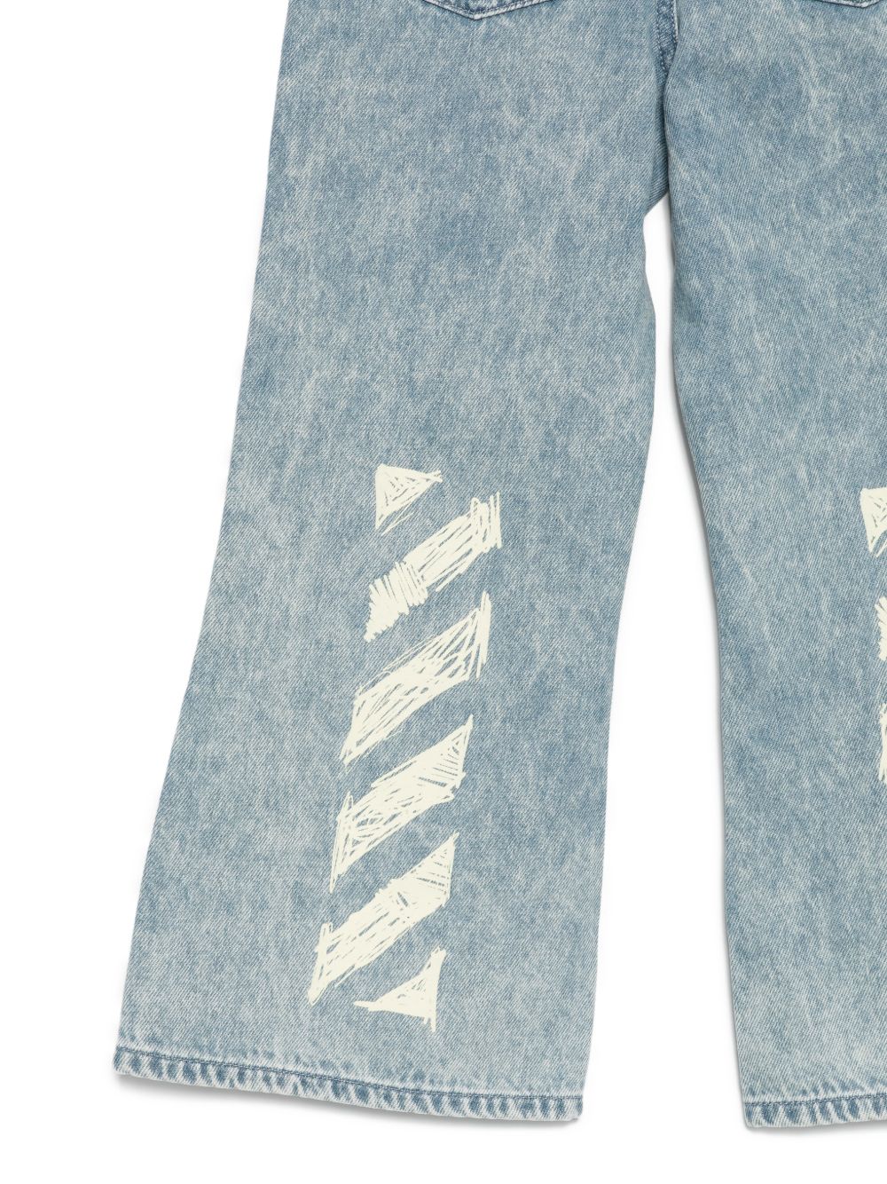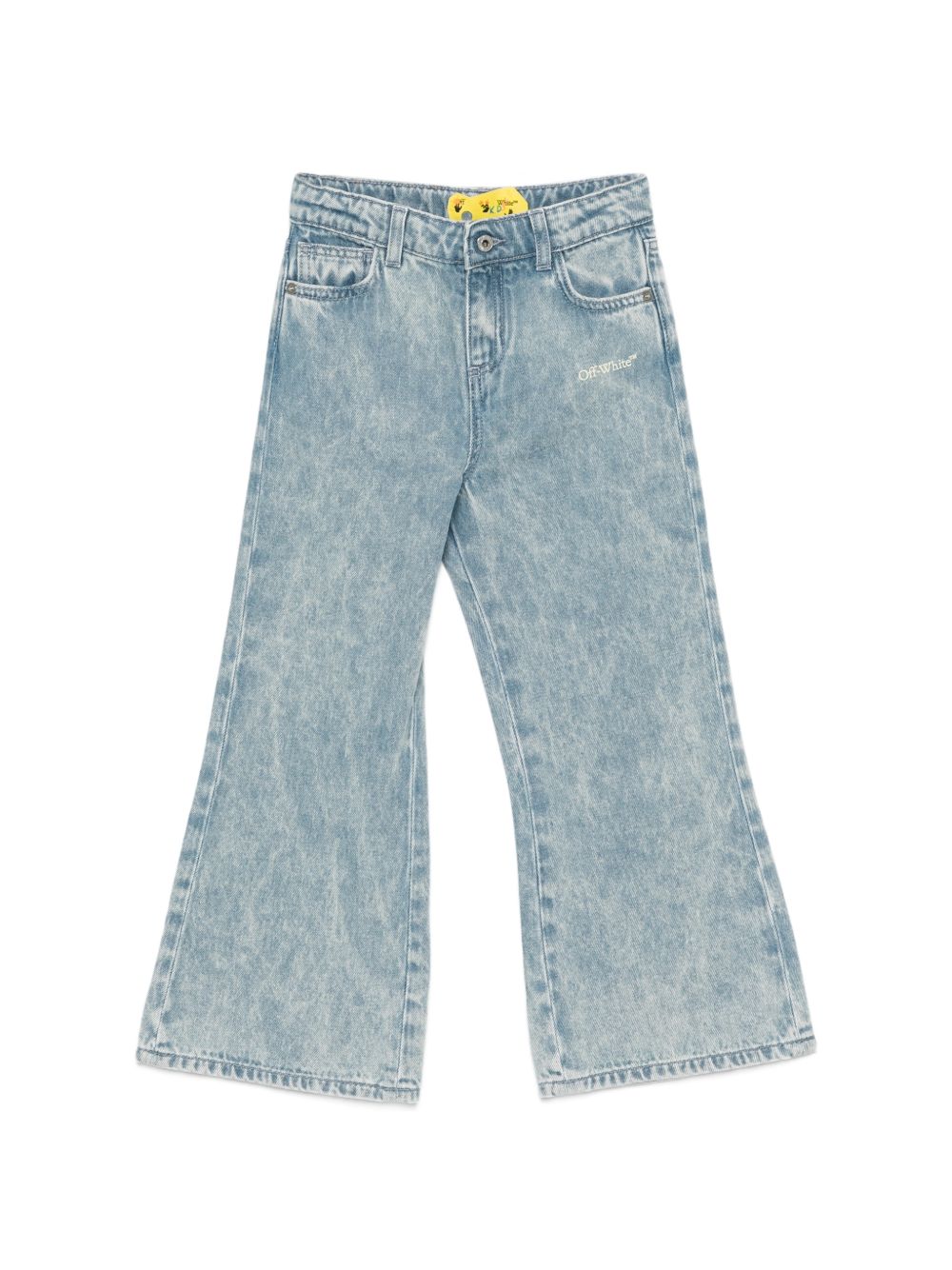 Dettagli stampati in blu, cinque tasche, passanti per cintura, orlo svasato