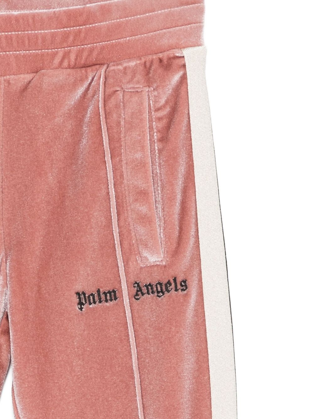 elastico in vita in velluto rosa, tasche laterali con spacchi, logo ricamato