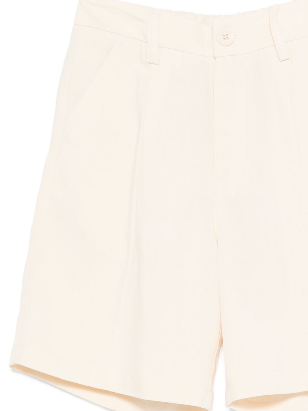 Shorts beige, vita elasticizzata, chiusura a bottoni, passanti, design sartoriale, tasche laterali con cinture.