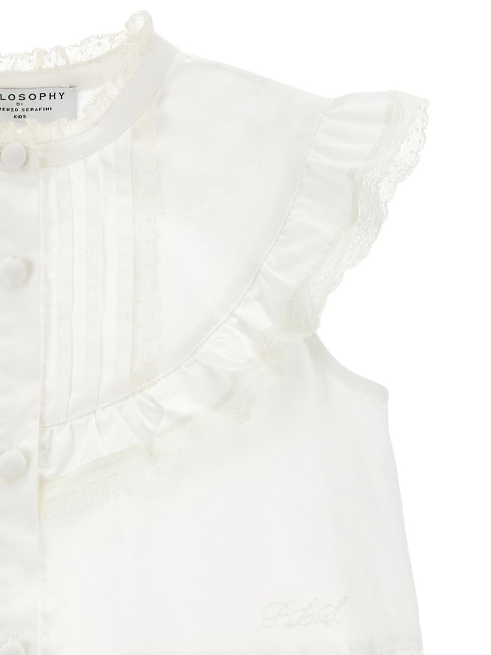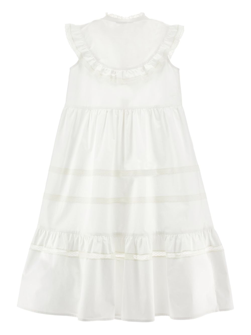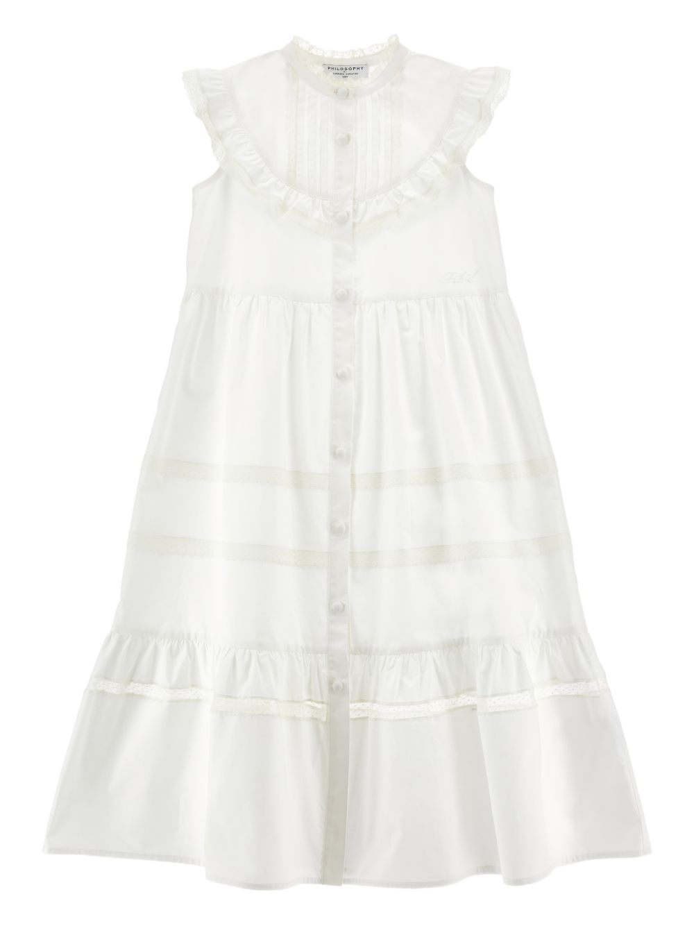 Abito con gonna a balze con chiusura a bottoni in pizzo bianco, colletto arricciato, senza maniche