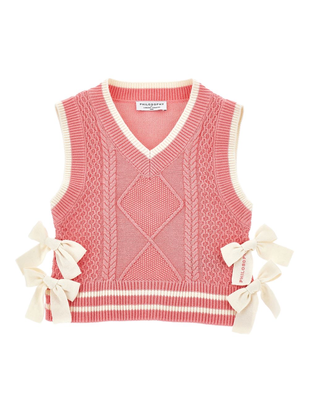 Gilet in maglia intrecciata con fiocchi, rosa, scollo a V, orlo elasticizzato.