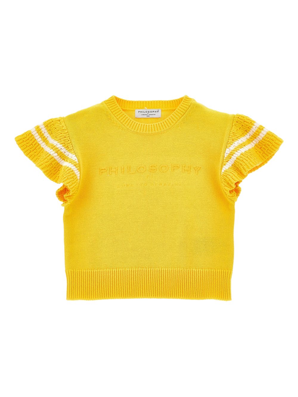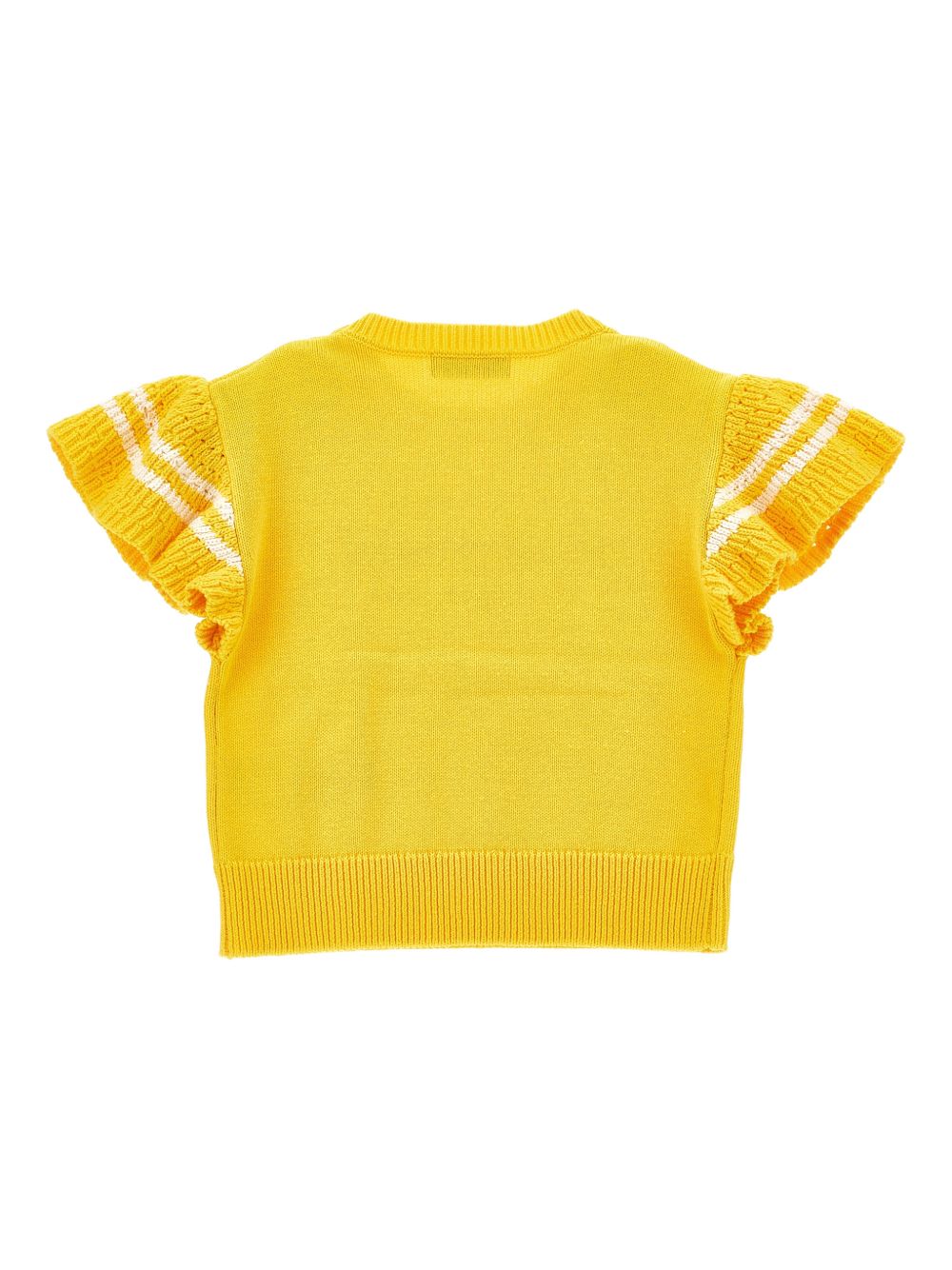 Maglia gialla con maniche con volant, dettaglio arricciato, scollo tondo, lavorazione a maglia, dettaglio logo