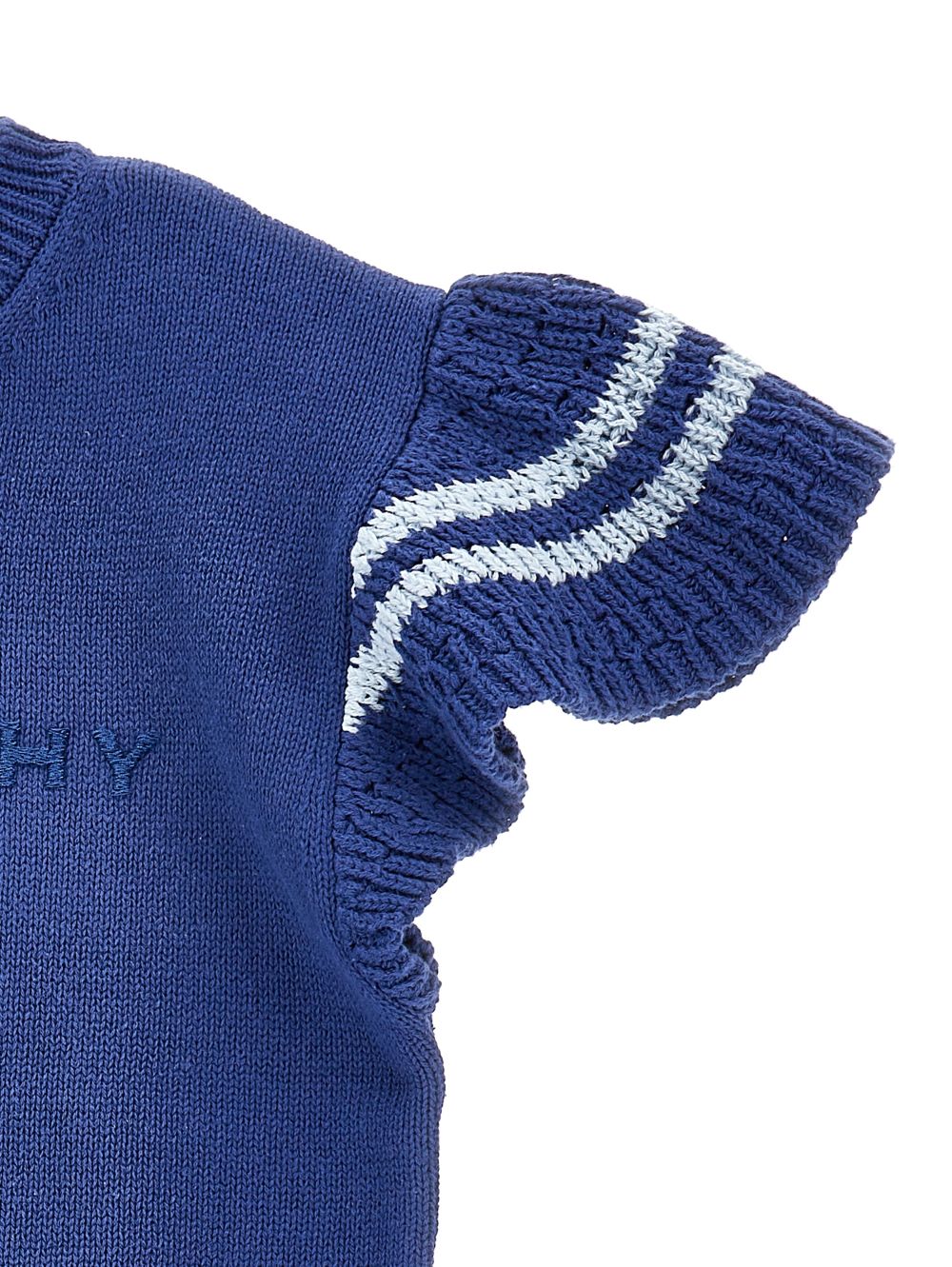 Maglia con maniche arricciate, blu, dettagli a righe, orlo a coste, scollo rotondo, logo ricamato
