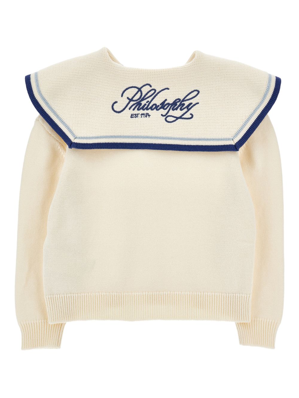 Maglia color bianco sporco, dettagli in metallo, logo ricamato, collo alla marinara, maniche lunghe