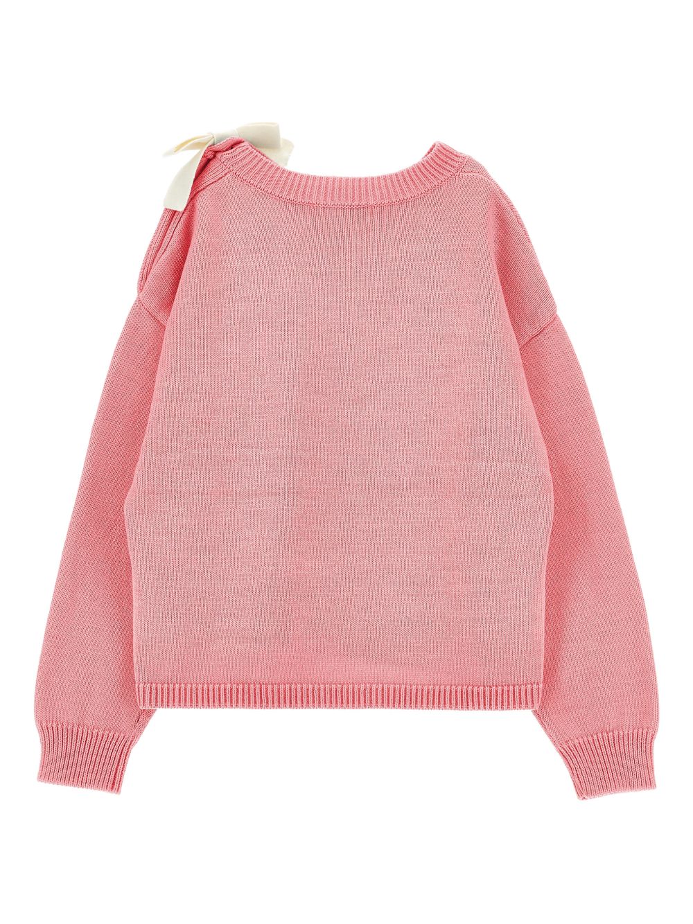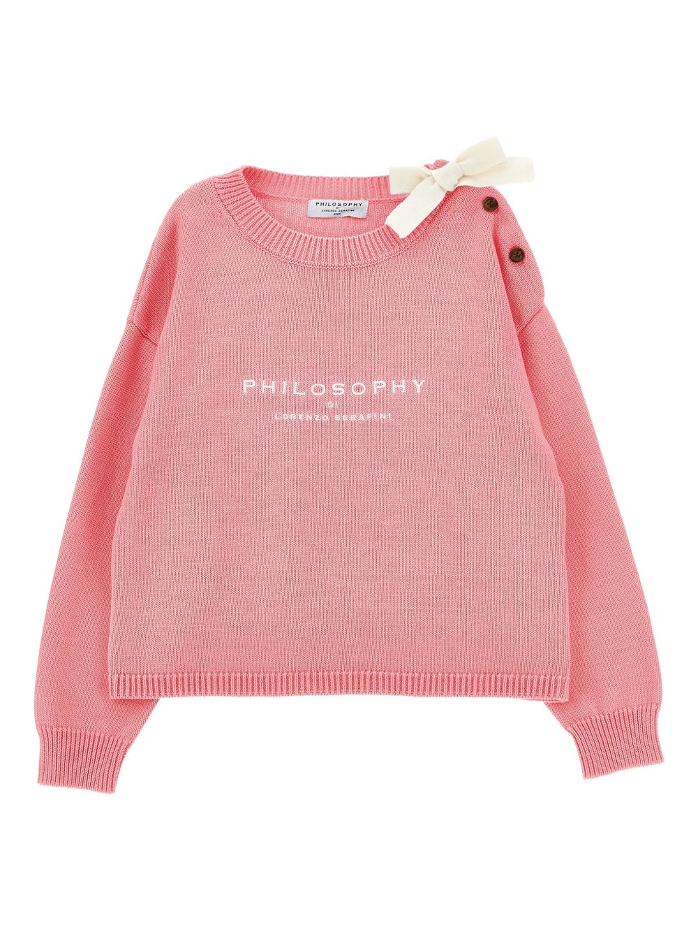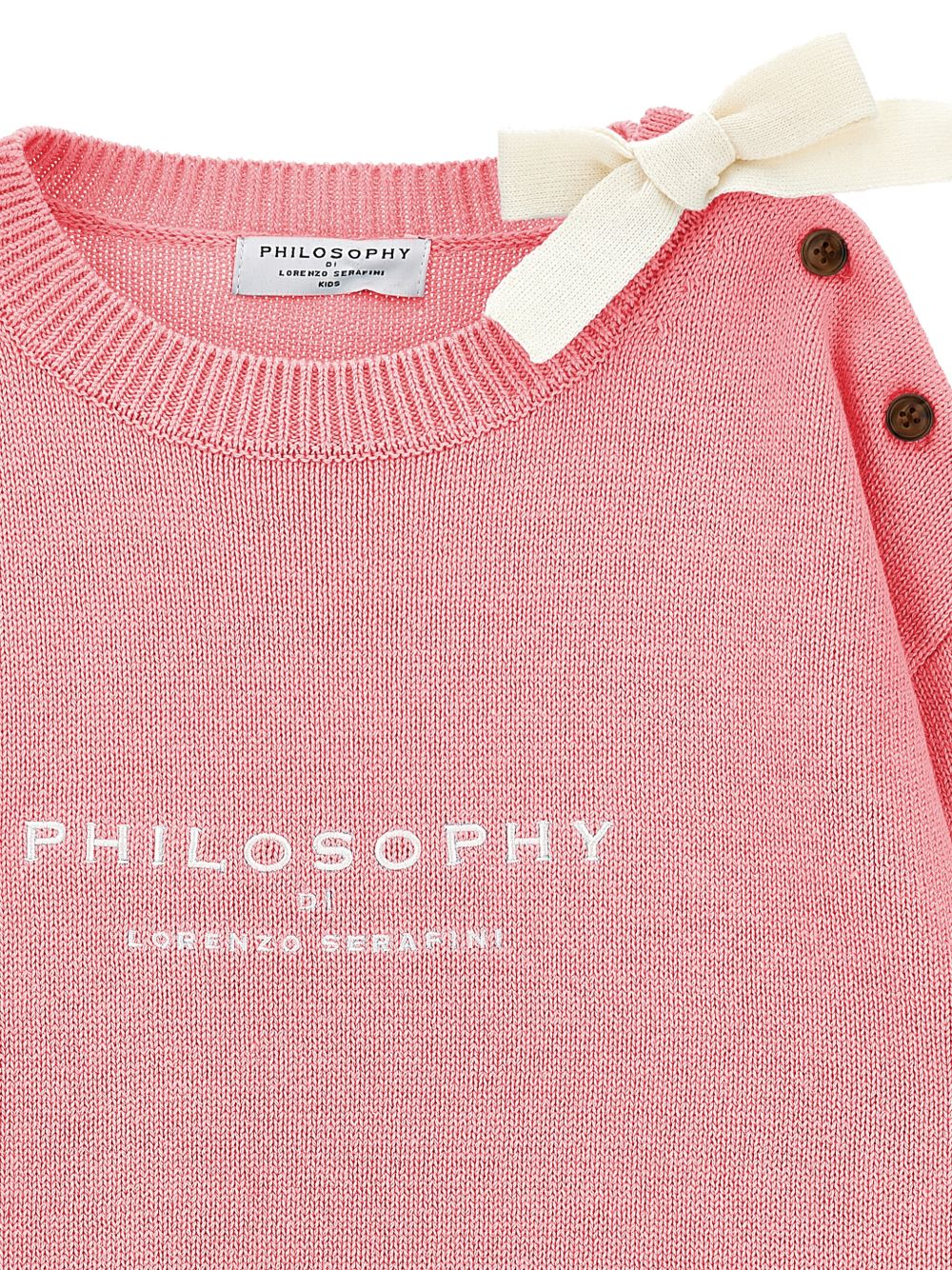 Maglione con logo ricamato, rosa, dettaglio fiocco, spalle abbottonate, bordi a coste, scollo tondo