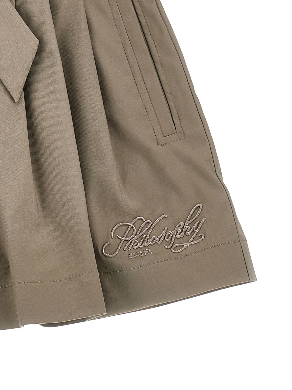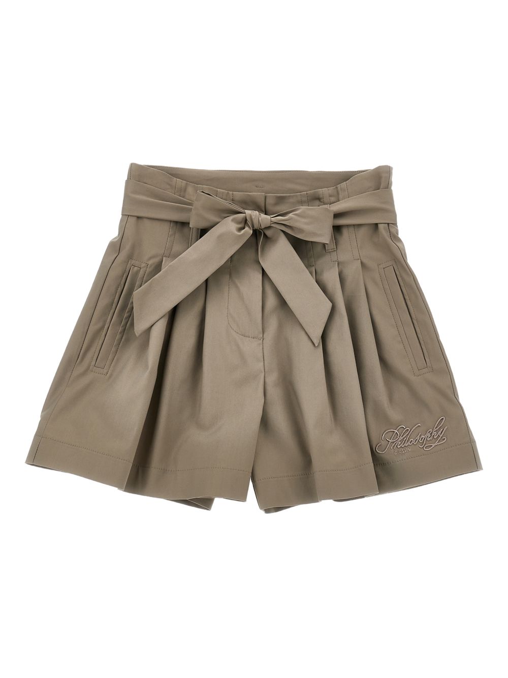 Shorts con cintura con logo ricamato color tortora, tasche laterali e pieghe