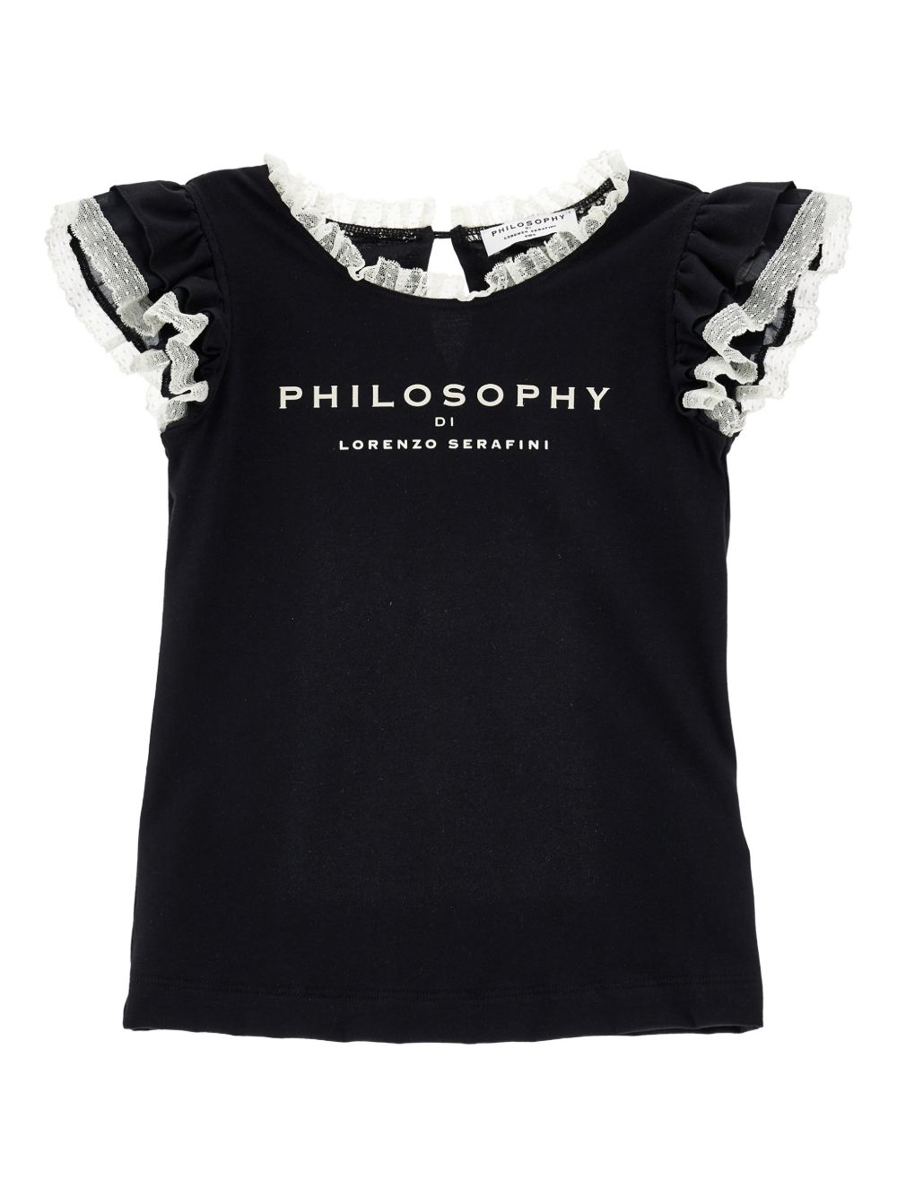 T-shirt nera con maniche arricciate con bordo in pizzo, scollo tondo, dettaglio a buco della serratura sul retro