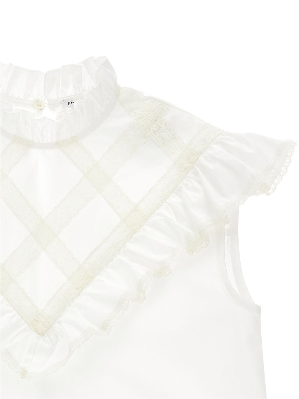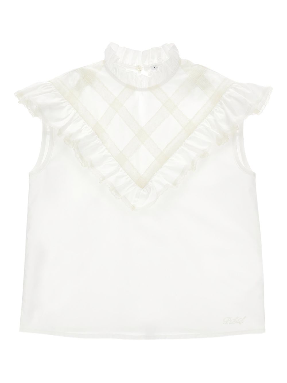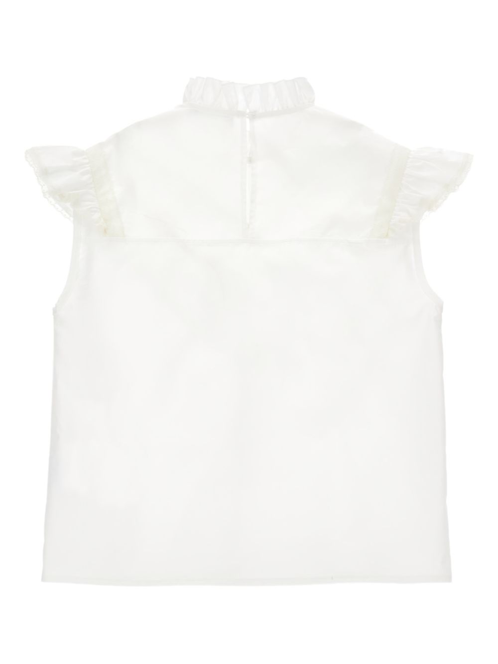 Top con volant, bianco, collo alto, senza maniche, chiusura posteriore con bottoni