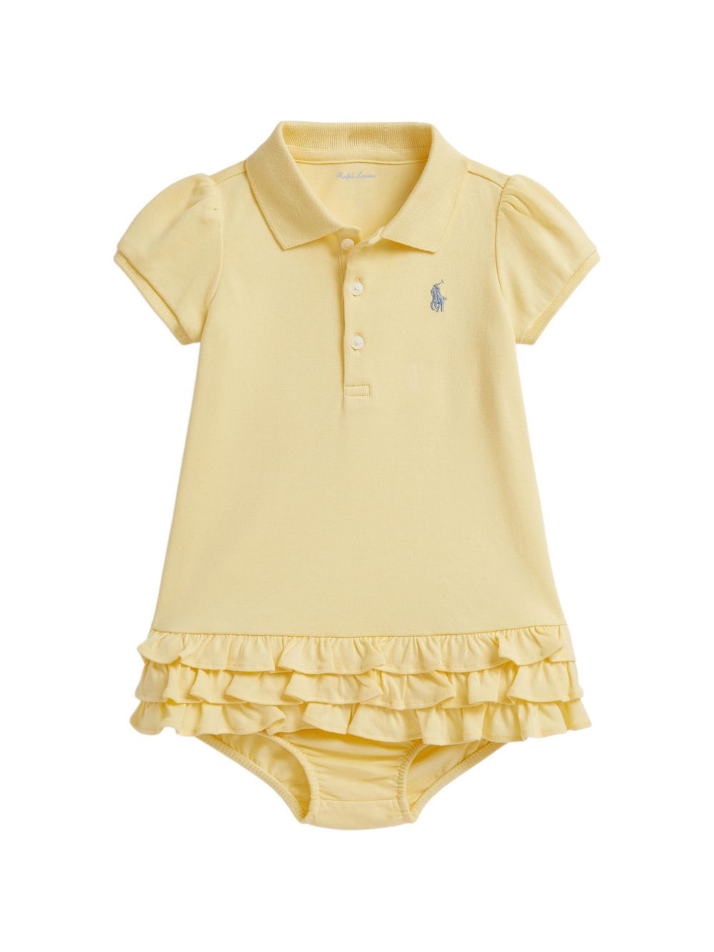 Baby Set giallo con colletto polo a coste, cannoncino a tre bottoni, maniche corte a palloncino, caratteristico logo Pony ricamato, balxe increspate, pantaloncini abinati.
