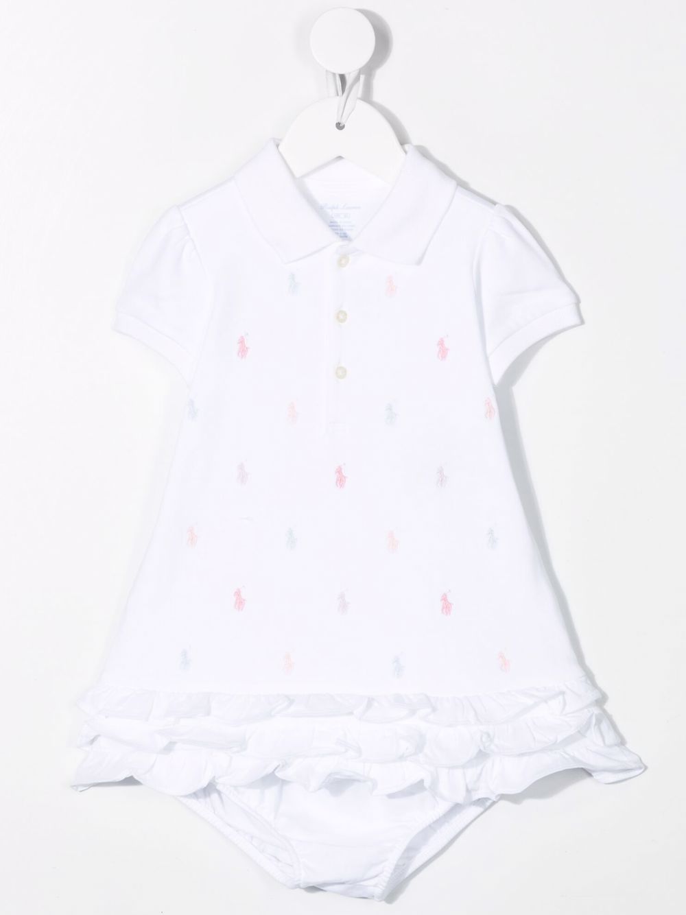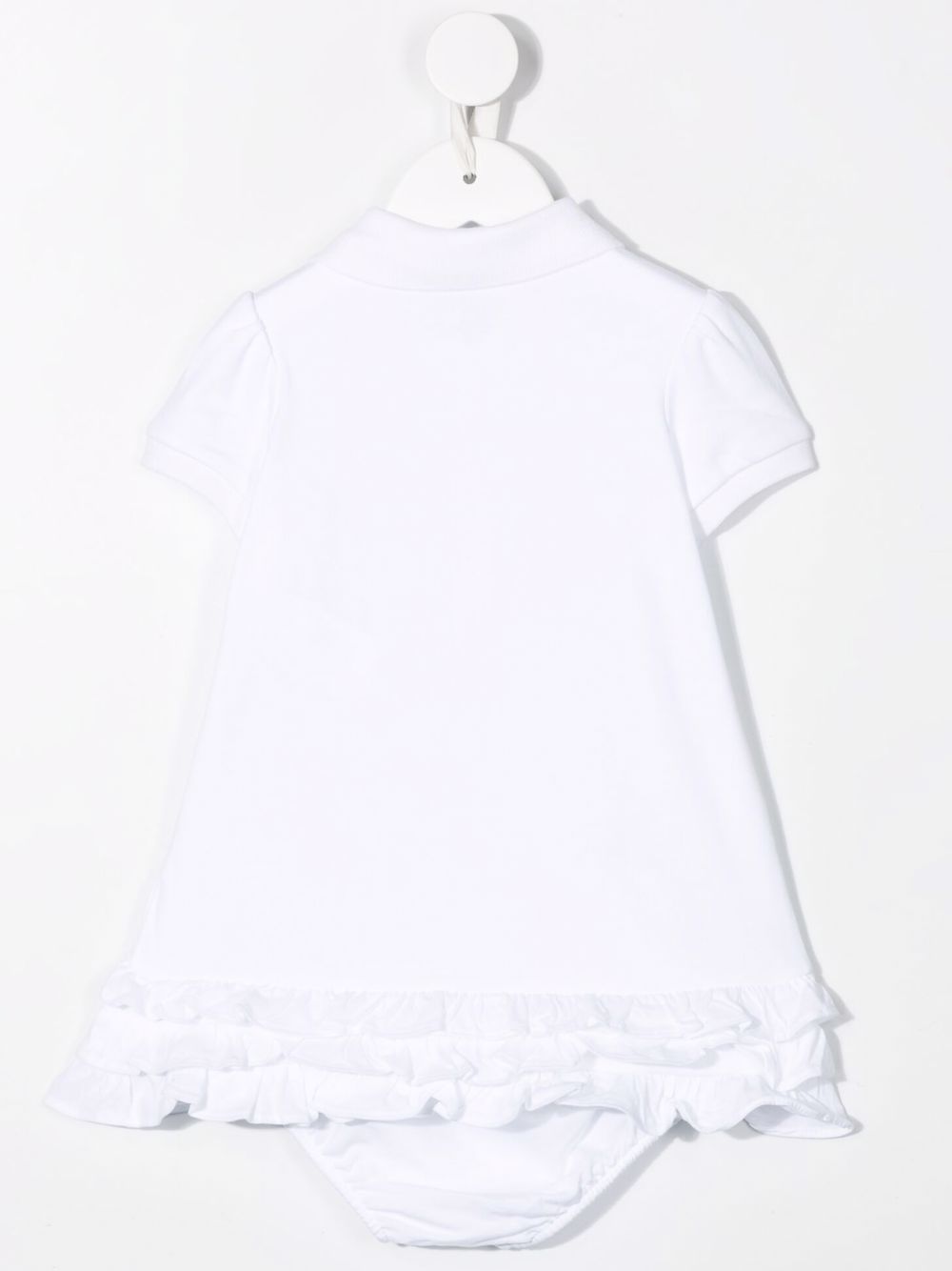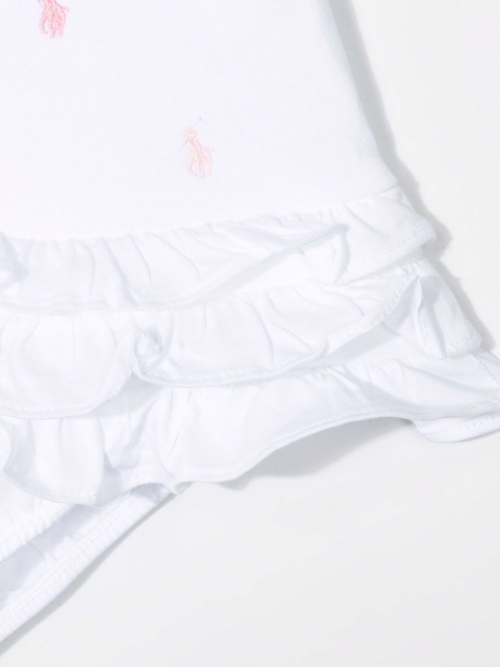 Baby Set in cotone bianco con logo ricamato, colletto corto, abbottonatura frontale, maniche corte, orlo arricciato, pantaloncini coordinati.