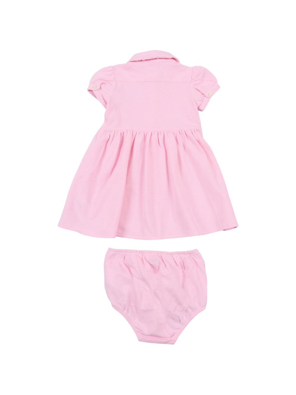 Baby Set chiusura con bottoni ricamati rosa maniche corte colletto a balze include slip.