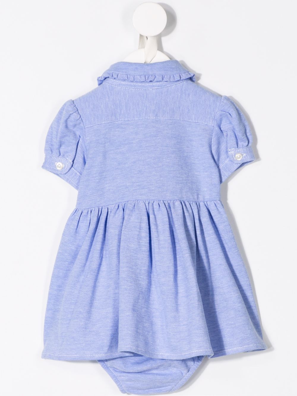 Baby Set blu, in cotone, colletto Peter Pan, abbottonatura frontale, bordo con icrespature, manica corta, gonna svsata e design corta.