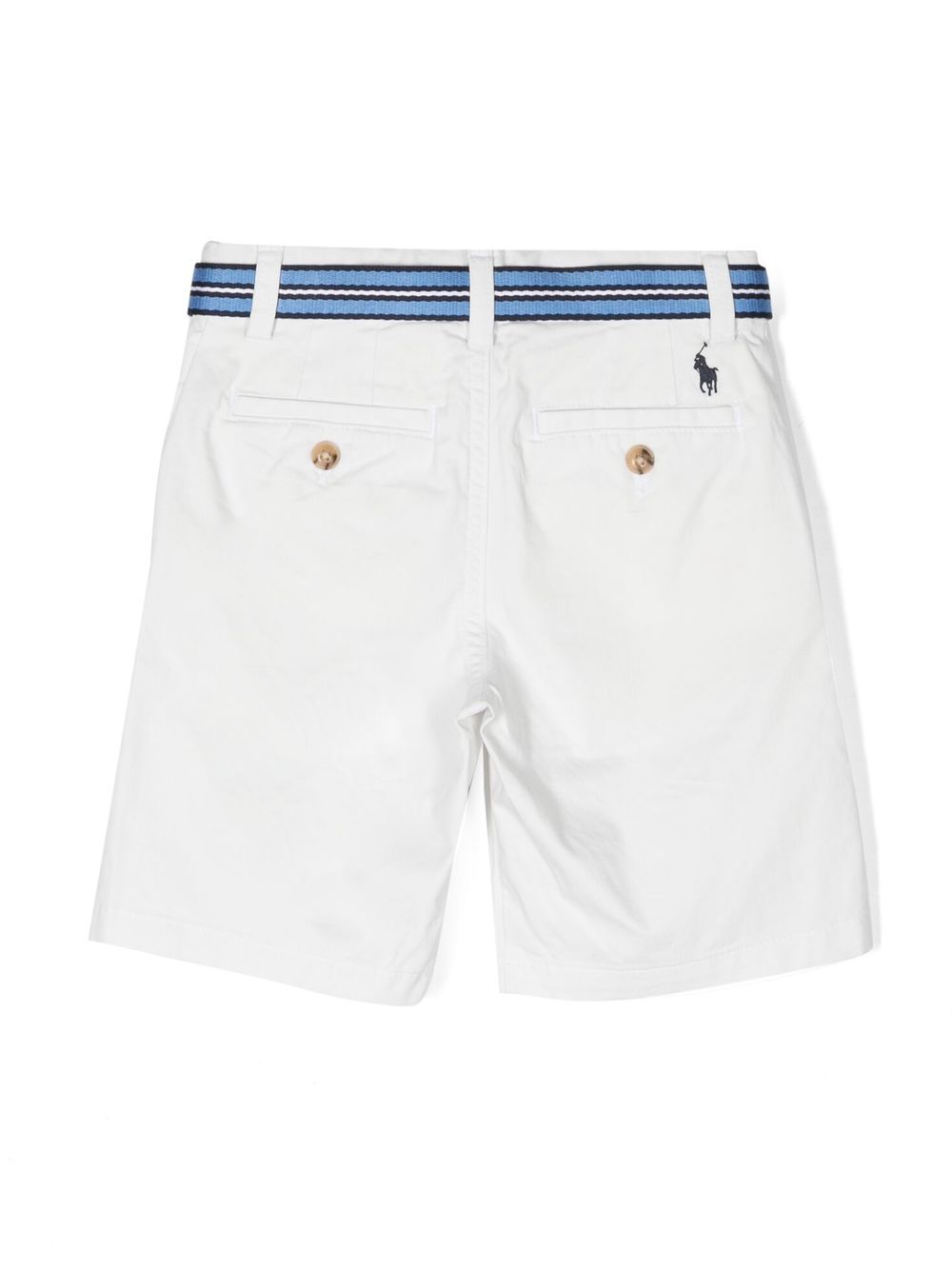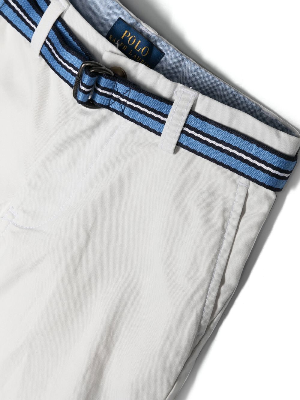 cotone elasticizzato bianco sporco/blu con logo ricamato sul retro, vita con cintura, chiusura con zip e bottone nascosti, due tasche diagonali laterali, due tasche posteriori a filetto, orlo dritto