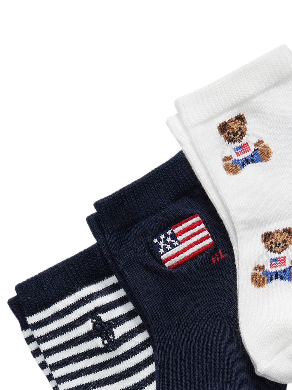 Set di tre calzini, a righe bianche e blu, motivo orsetto, motivo bandiera, polsini a coste.