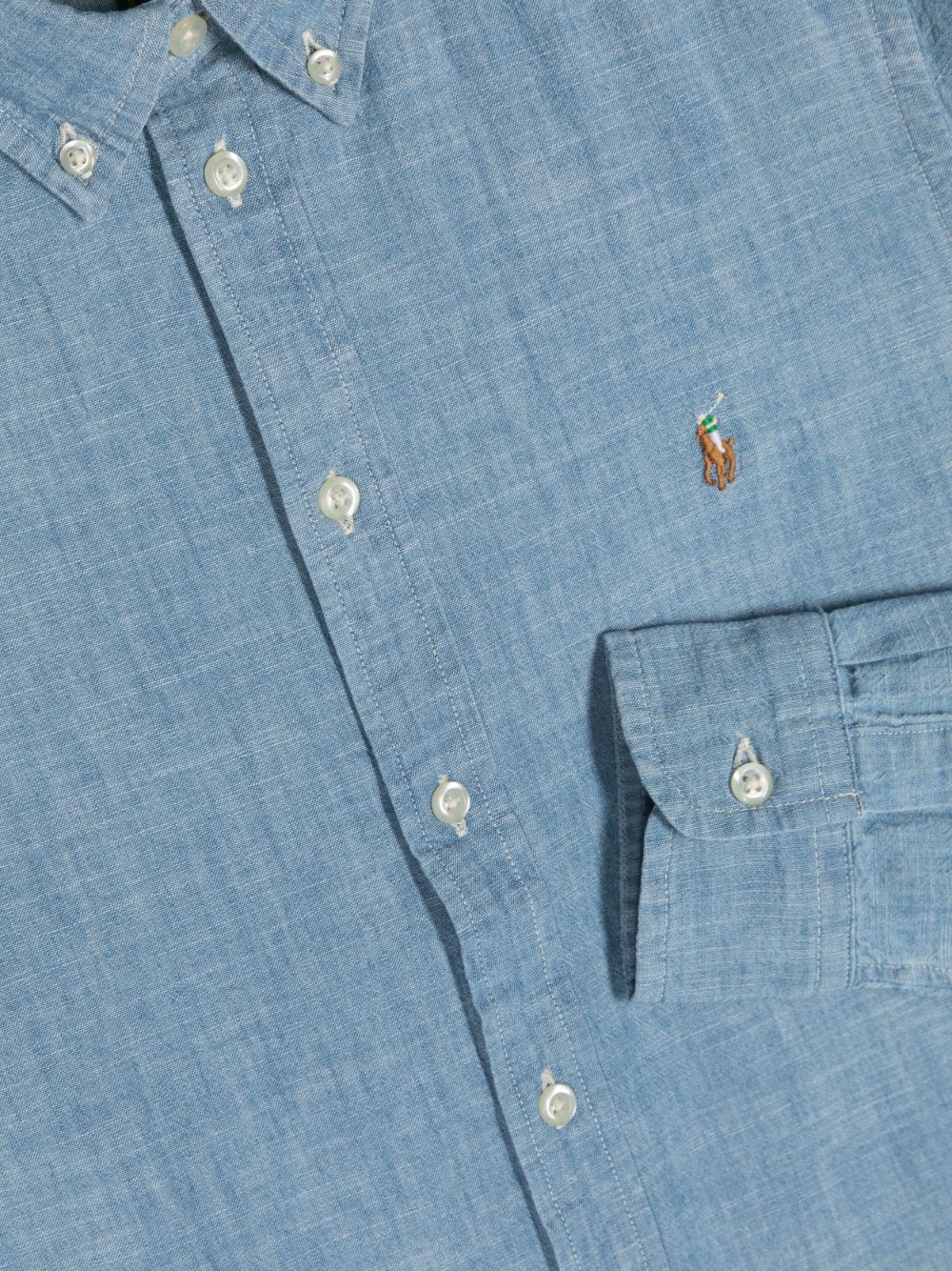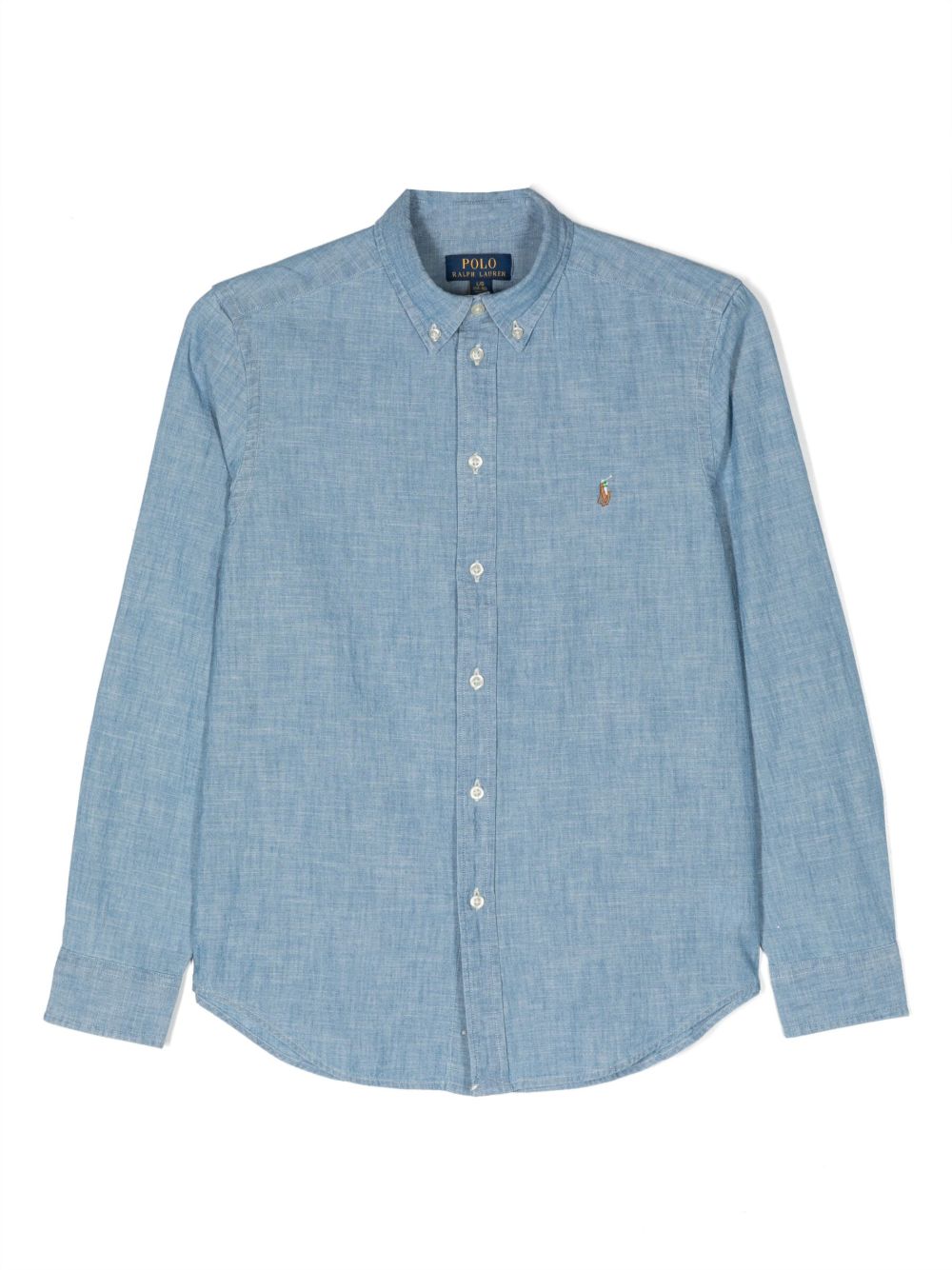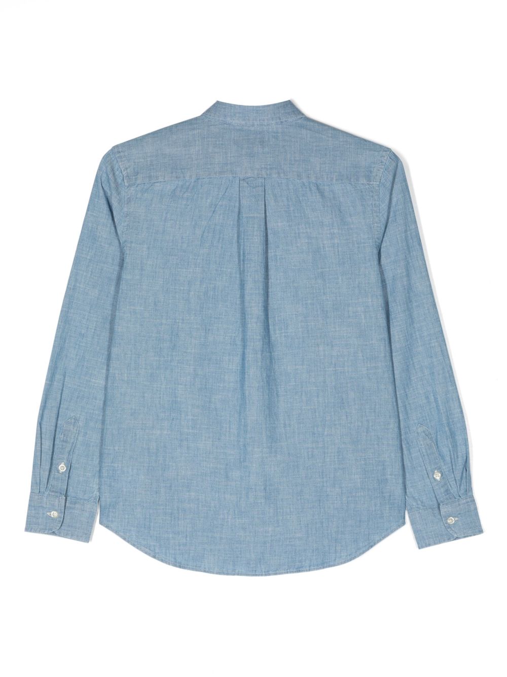 Camicia in denim, cotone, colletto classico, applicazione con logo sul petto, maniche lunghe, polsini aderenti, chiusura frontale con abbottonatura.