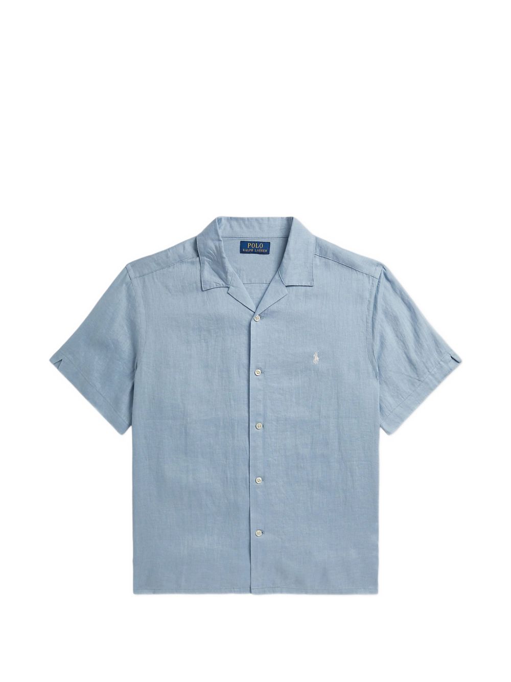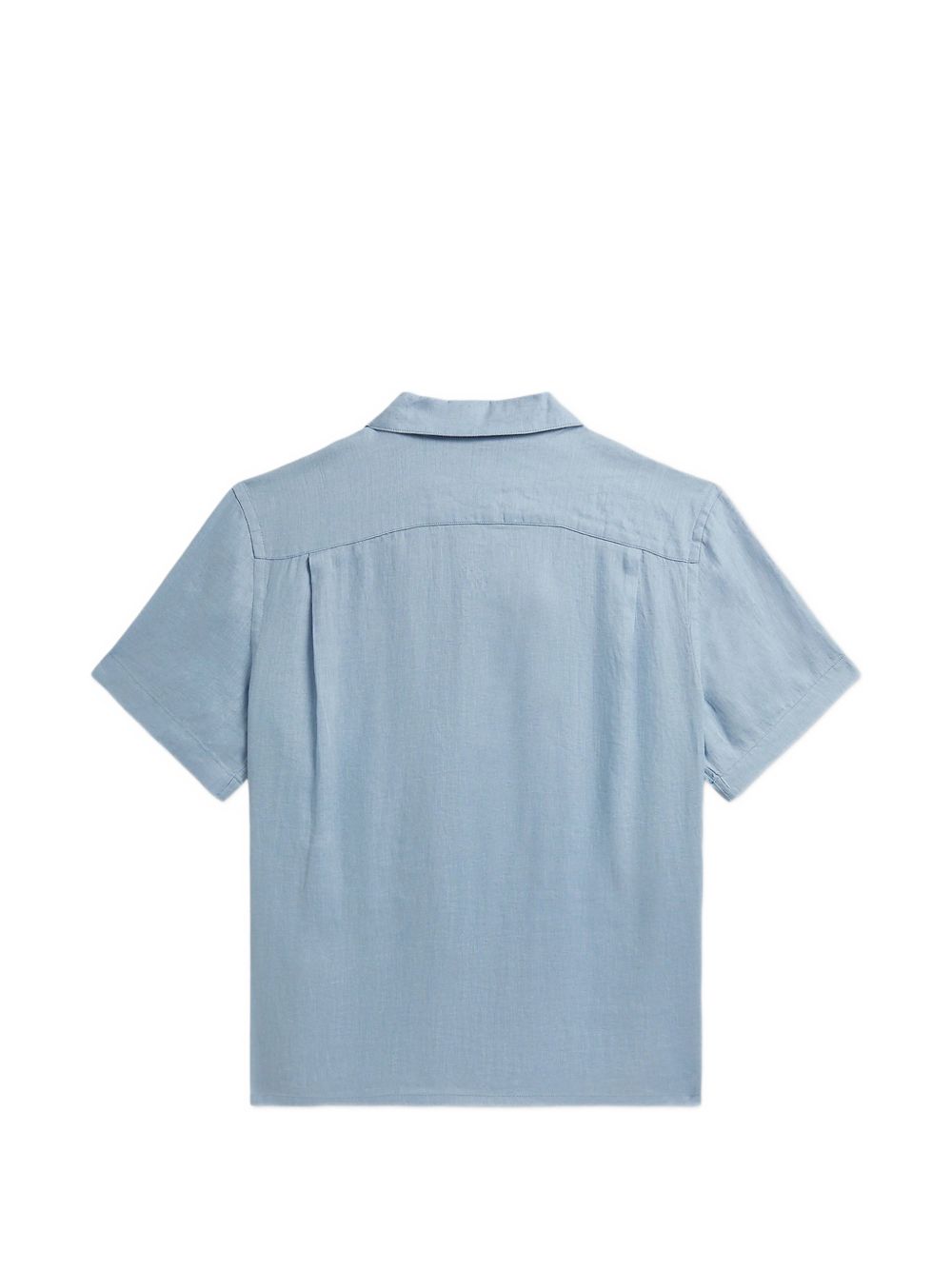 Camicia blu, maniche corte, chiusura con bottoni colletto revers, logo sul petto, carré posteriore.