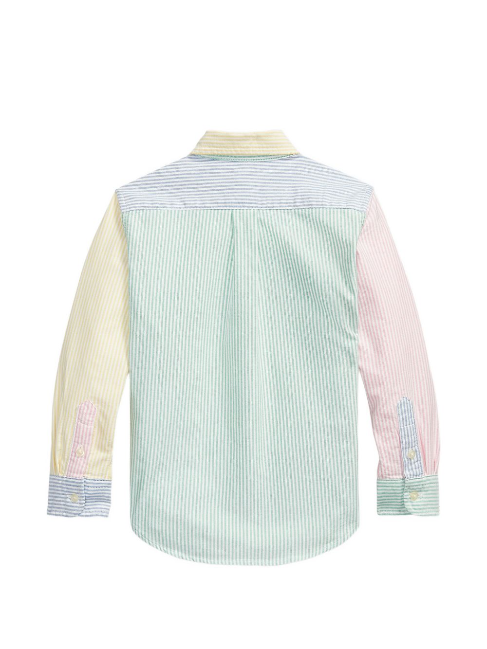 Camicia a righe blu, verdi e multicolori, tasca sul petto, chiusura frontale con bottoni, maniche lunghe, collo a punta.