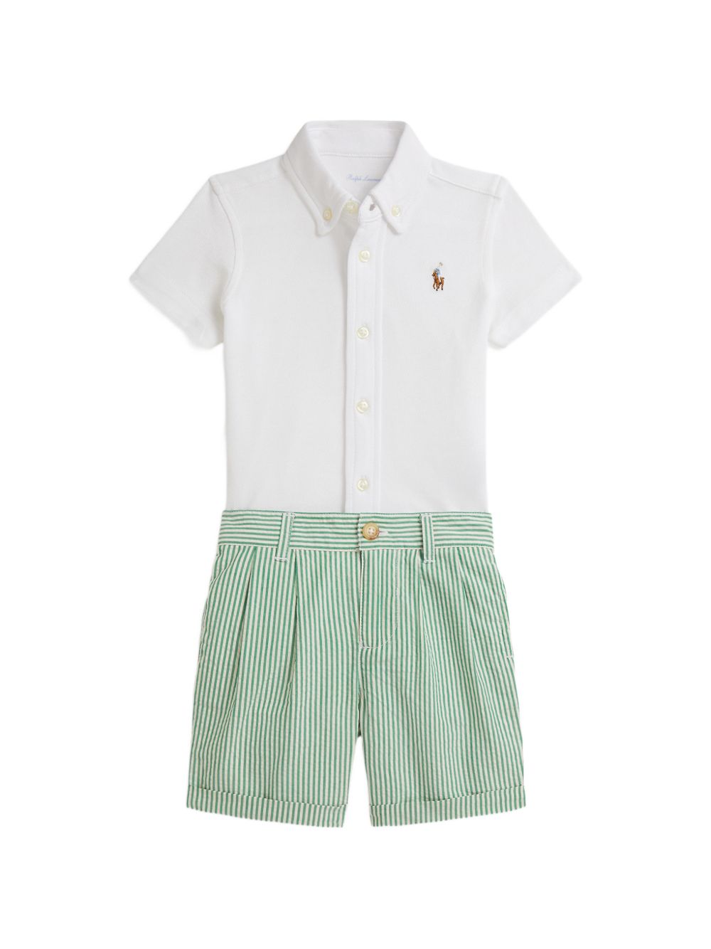 camicia in cotone bianco/verde, pantaloncini a righe seersucker, colletto button-down, abbottonatura frontale, maniche corte