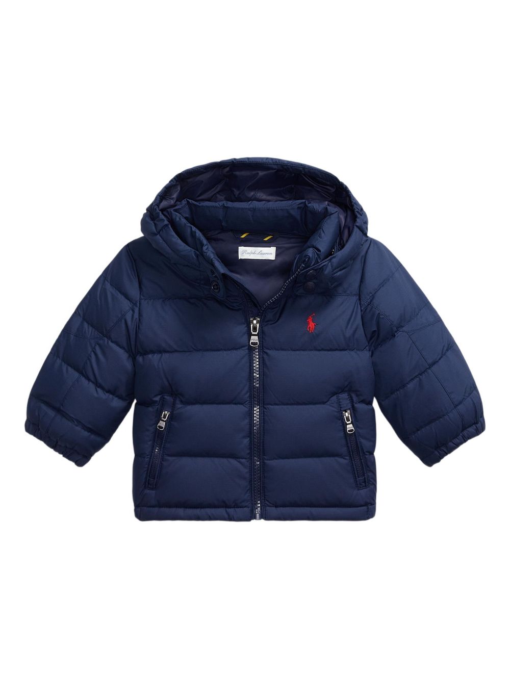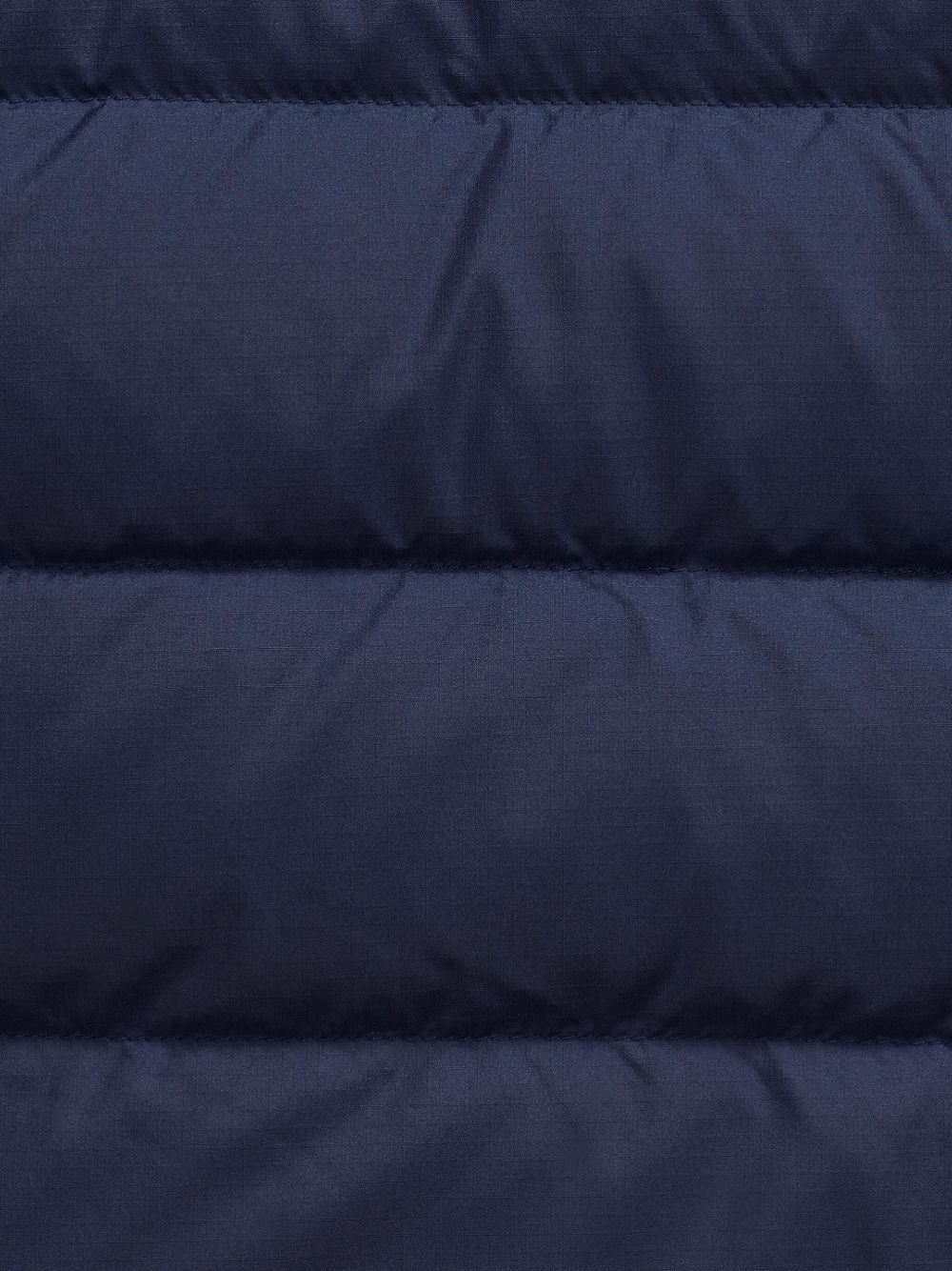 Piumino trapuntato con cappuccio, blu navy, design trapuntanto, scollo con cappuccio, chiusura cn zip, due tasche, maniche lunghe