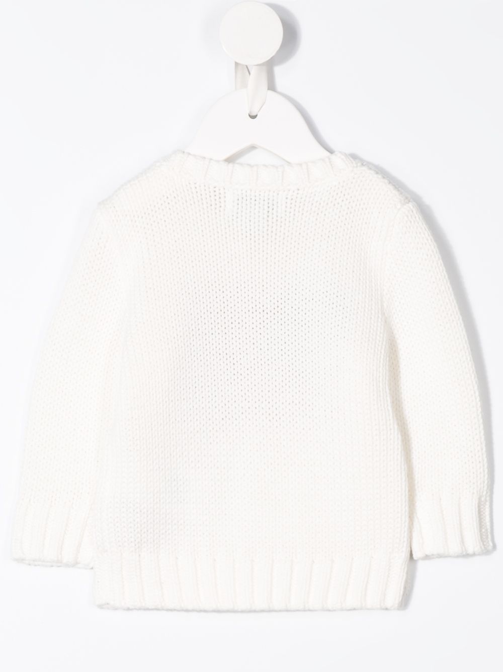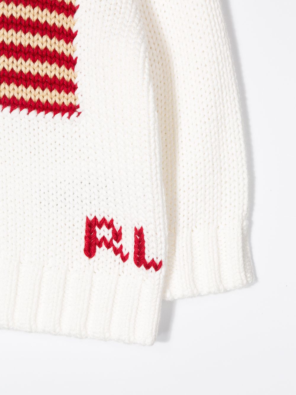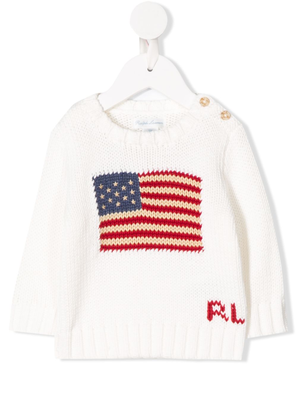Maglione bianco in cotone a maglia con bandiera di Ralph Lauren Kids, caratterizzato da scollo rotondo a coste, chiusura con bottoni sulle spalle, lavorazione a maglia, maniche lunghe e orlo e polsini a coste.
