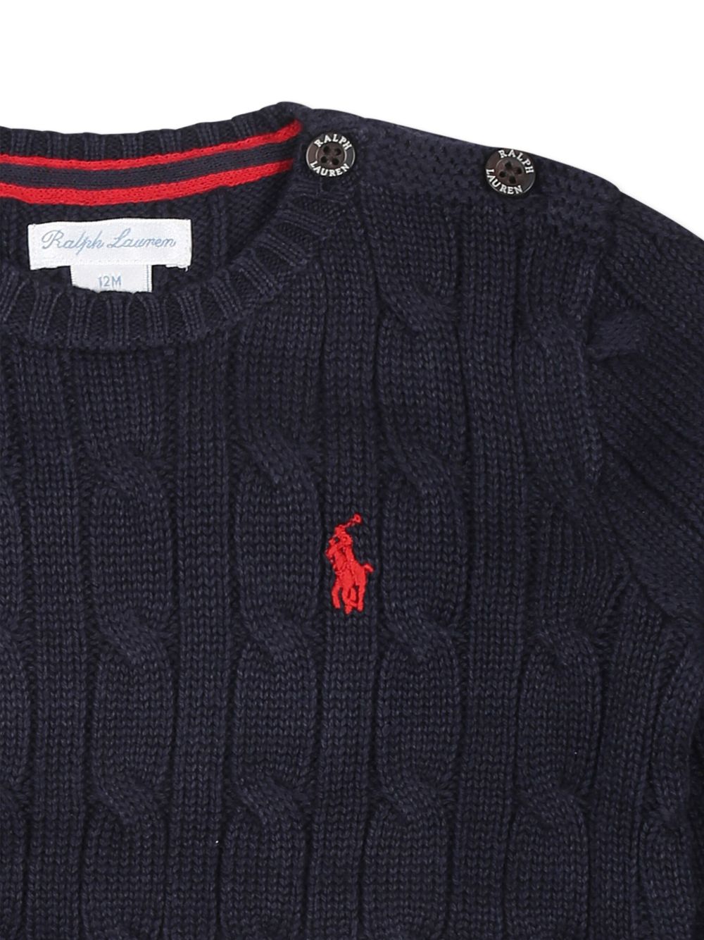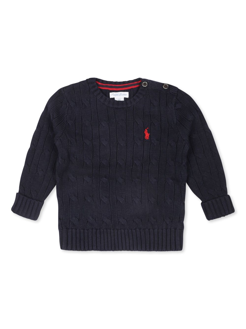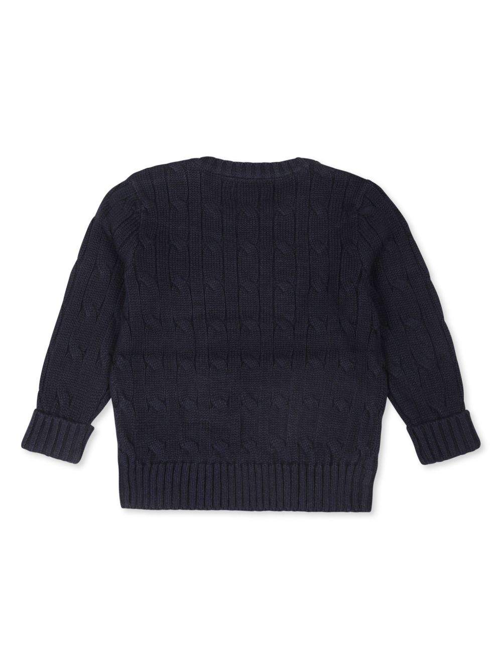 Maglia a trecce in cotone blu navy, logo ricamato sul petto, chiusura con bottoni sulla spalla, girocollo, maniche lunghe, polsini e orlo a coste.