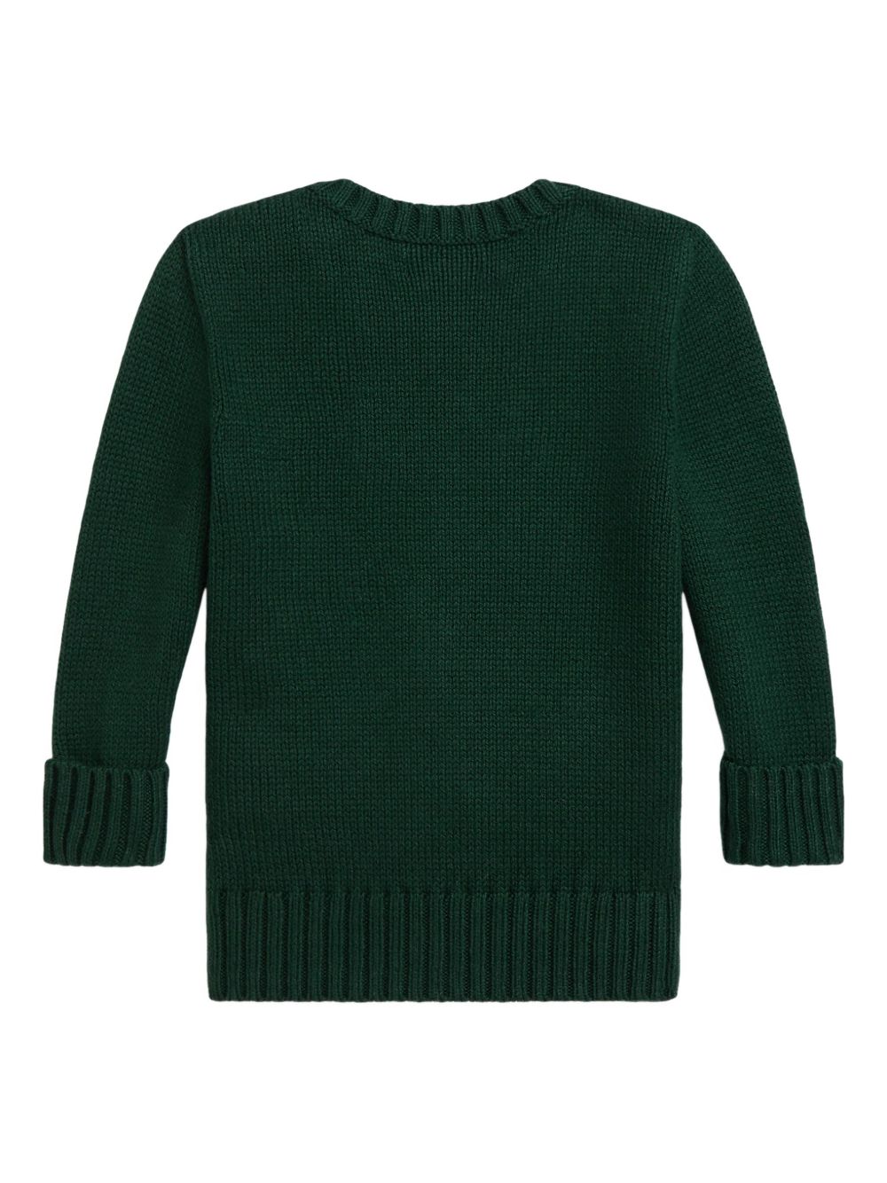 Maglione verde, design con orso ricamato, dettaglio con bottone sulla spalla, polsini a coste, orlo a coste