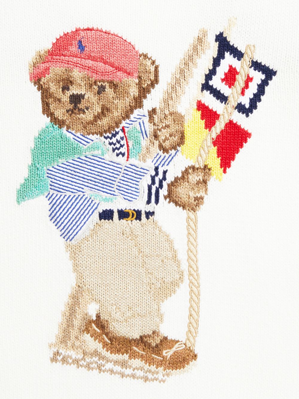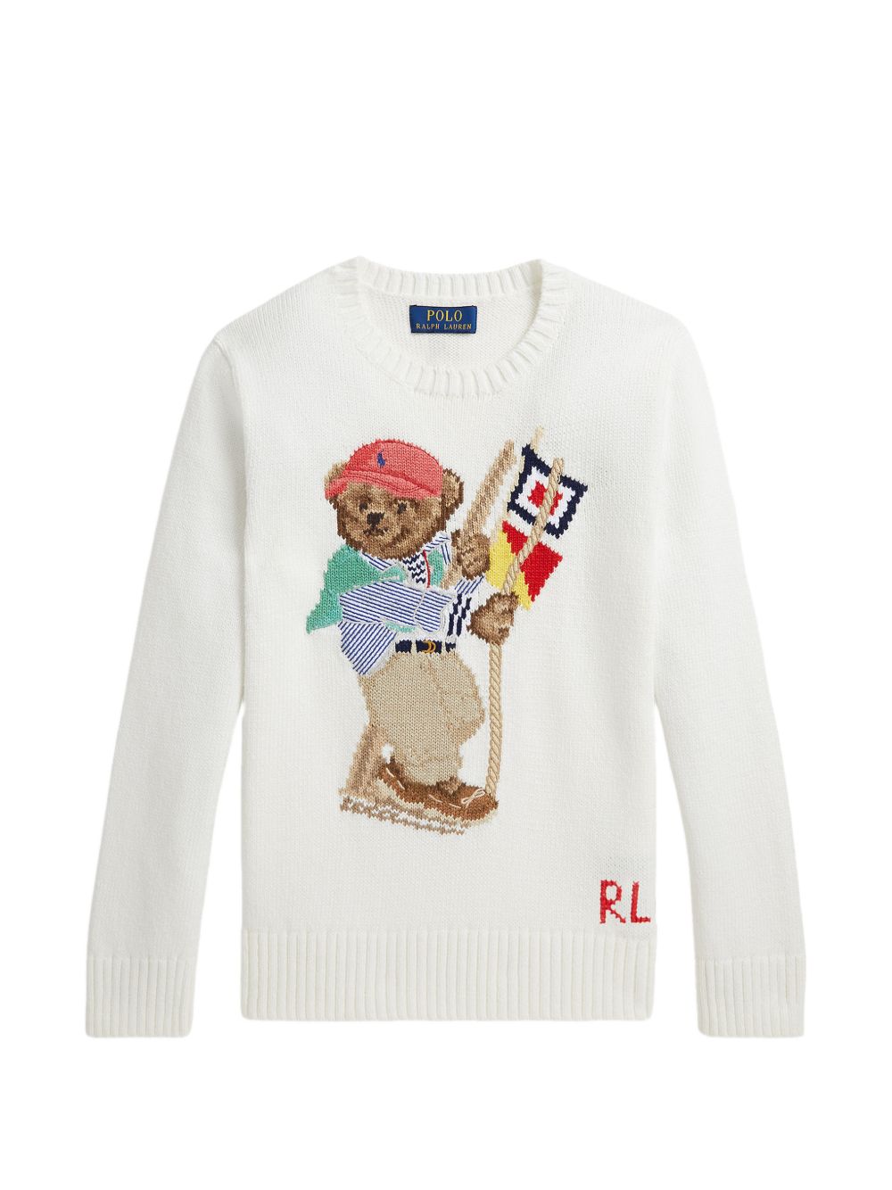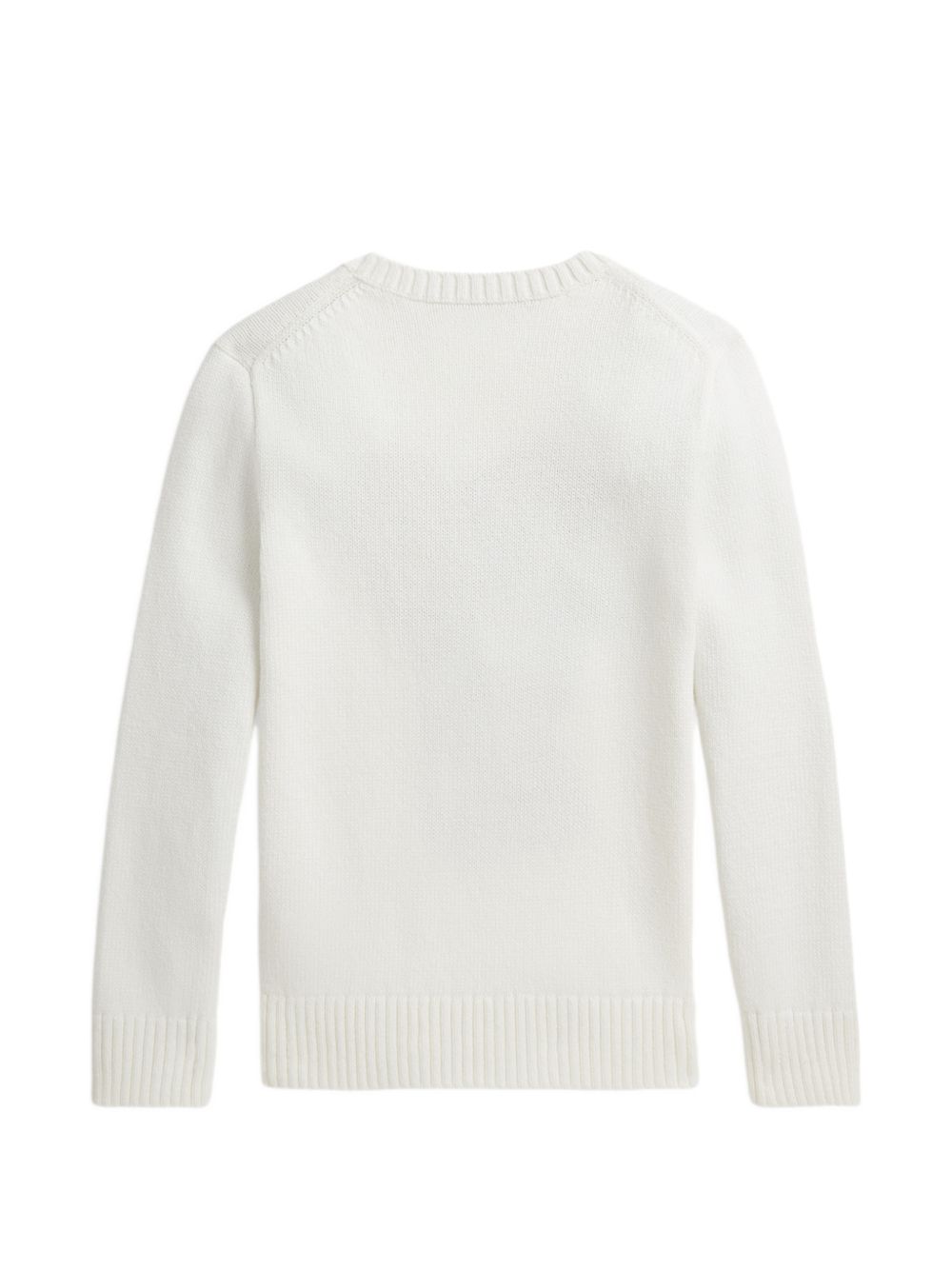 Maglione bianco, stampa con orso, decorazione con logo, girocollo, maniche lunghe, orlo a coste, in cotone.
