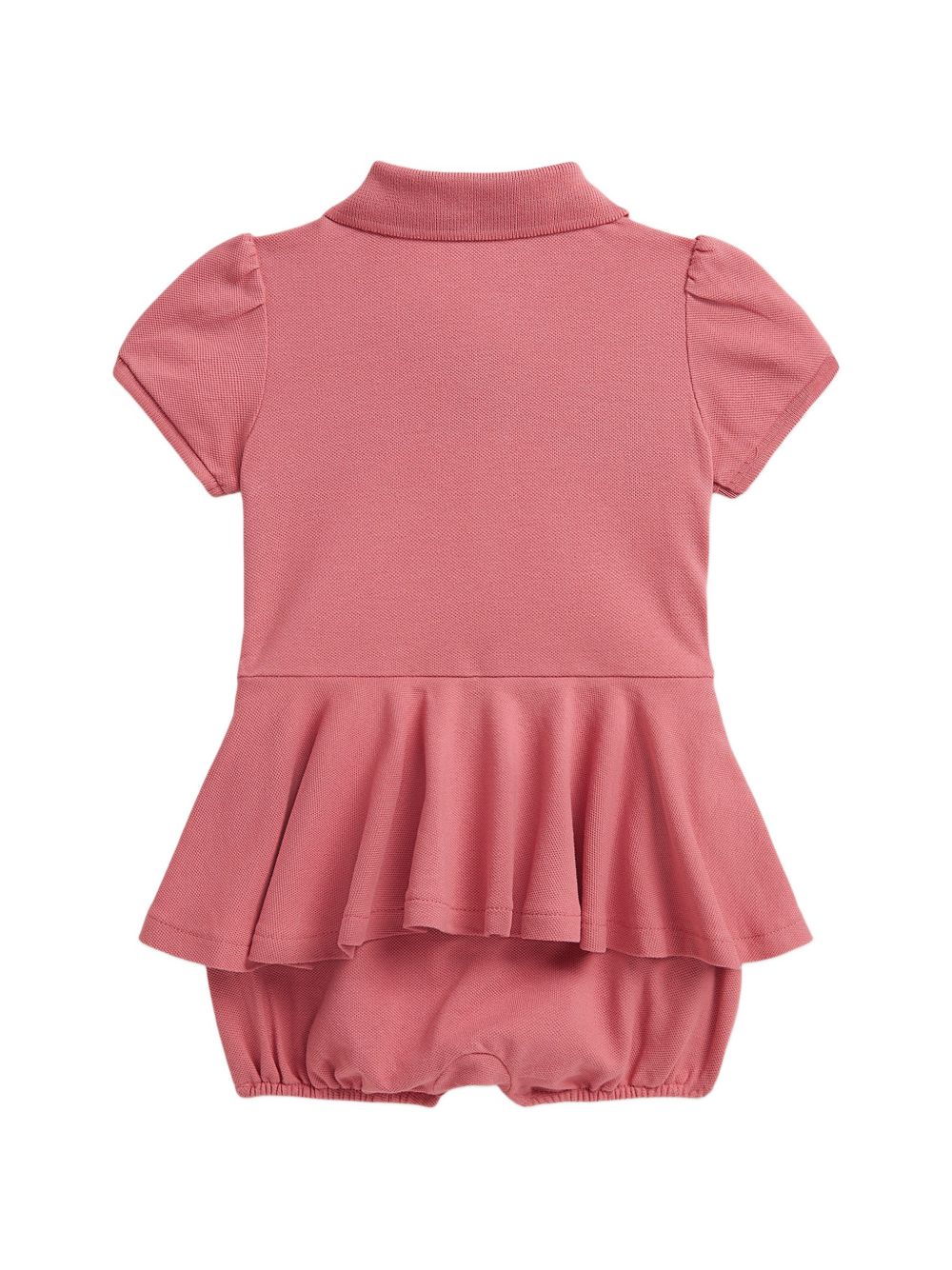 Pagliaccetto colletto polo rosa, maniche a sbuffo, chiusura frontale con bottoni, dettaglio logo, orlo arricciato