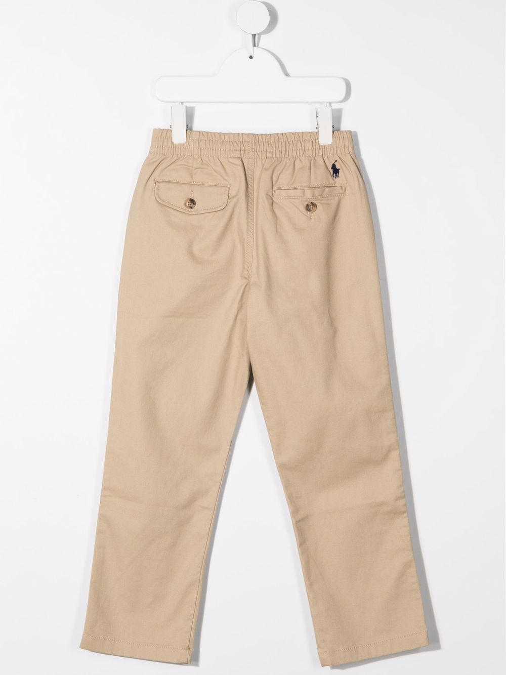 pantaloni kaki in cotone elasticizzato, elastico in vita, chiusura frontale con bottone e zip, passanti per cintura, due tasche laterali a fessura, due tasche posteriori a filetto, gamba dritta.