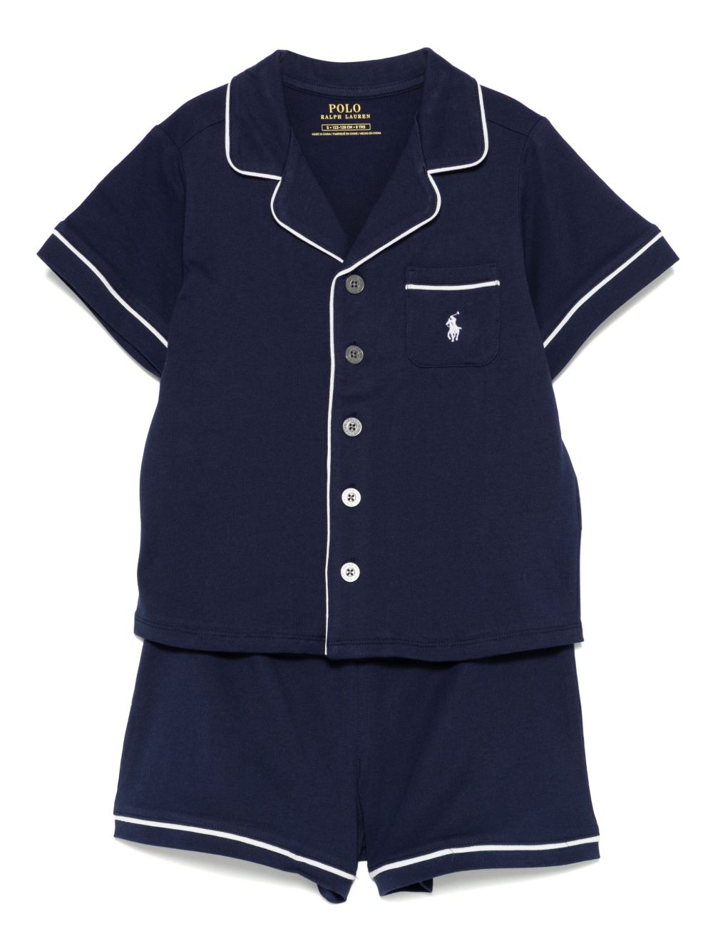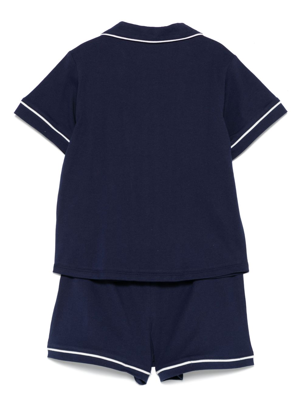 blu navy chiusura frontale con bottoni, elastico in vita, taschino applicato sul petto, finiture a contrasto