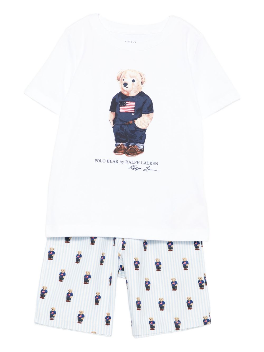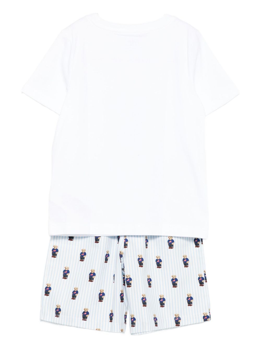 Stampa orsetto polo bianco, motivo a righe, maniche corte, elastico in vita, chiusura con coulisse
