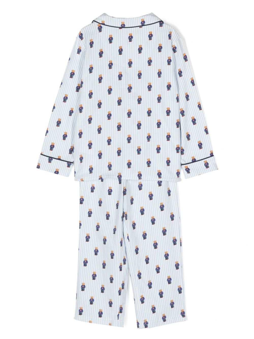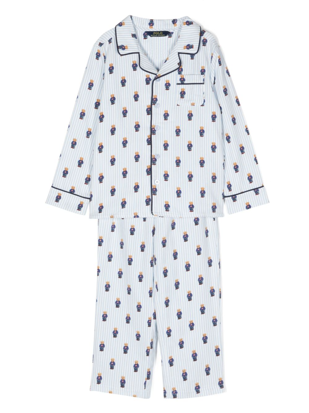 Set pigiama in flanella di cotone blu/bianco. Top del pigiama: chiusura frontale con bottoni, motivo a righe verticali, motivo Polo Bear distintivo, dettagli con bordino, colletto a punta, maniche lunghe, tasca applicata sul petto, orlo dritto. Pantaloni del pigiama: elastico in vita, vita media, motivo a righe verticali, motivo Polo Bear distintivo, due tasche laterali con spacco, gamba dritta.