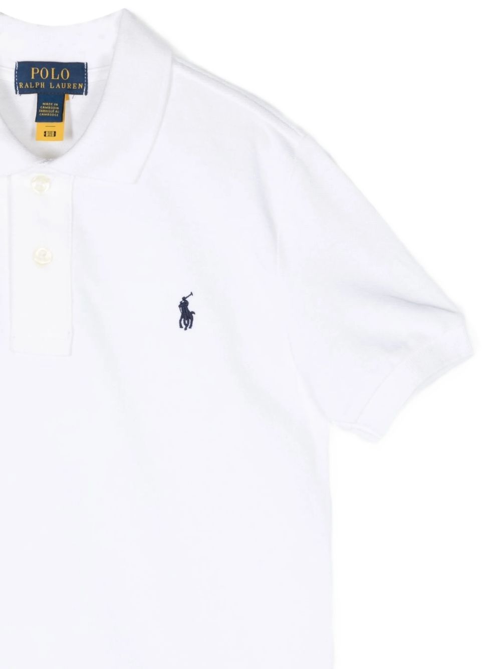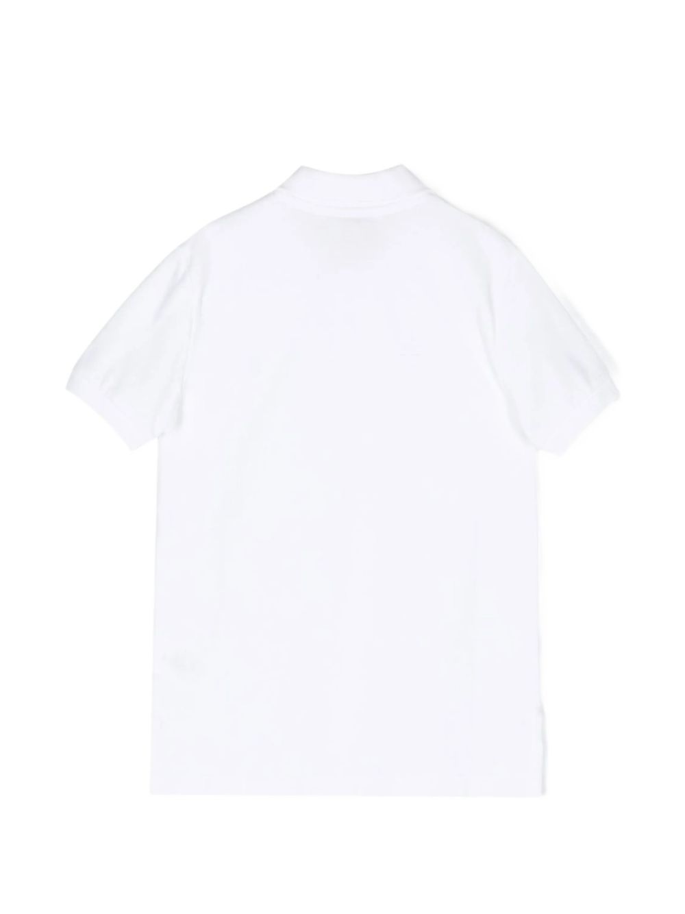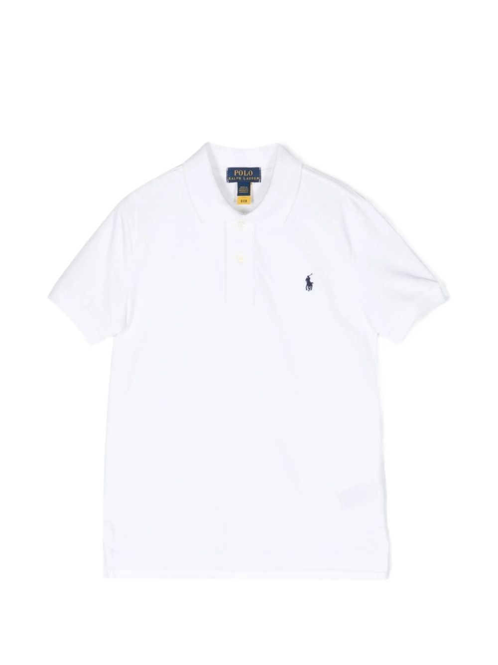 Polo bianco con logo blu ricamato, maniche corte, scollo con colletto ,chiusura con bottoni.