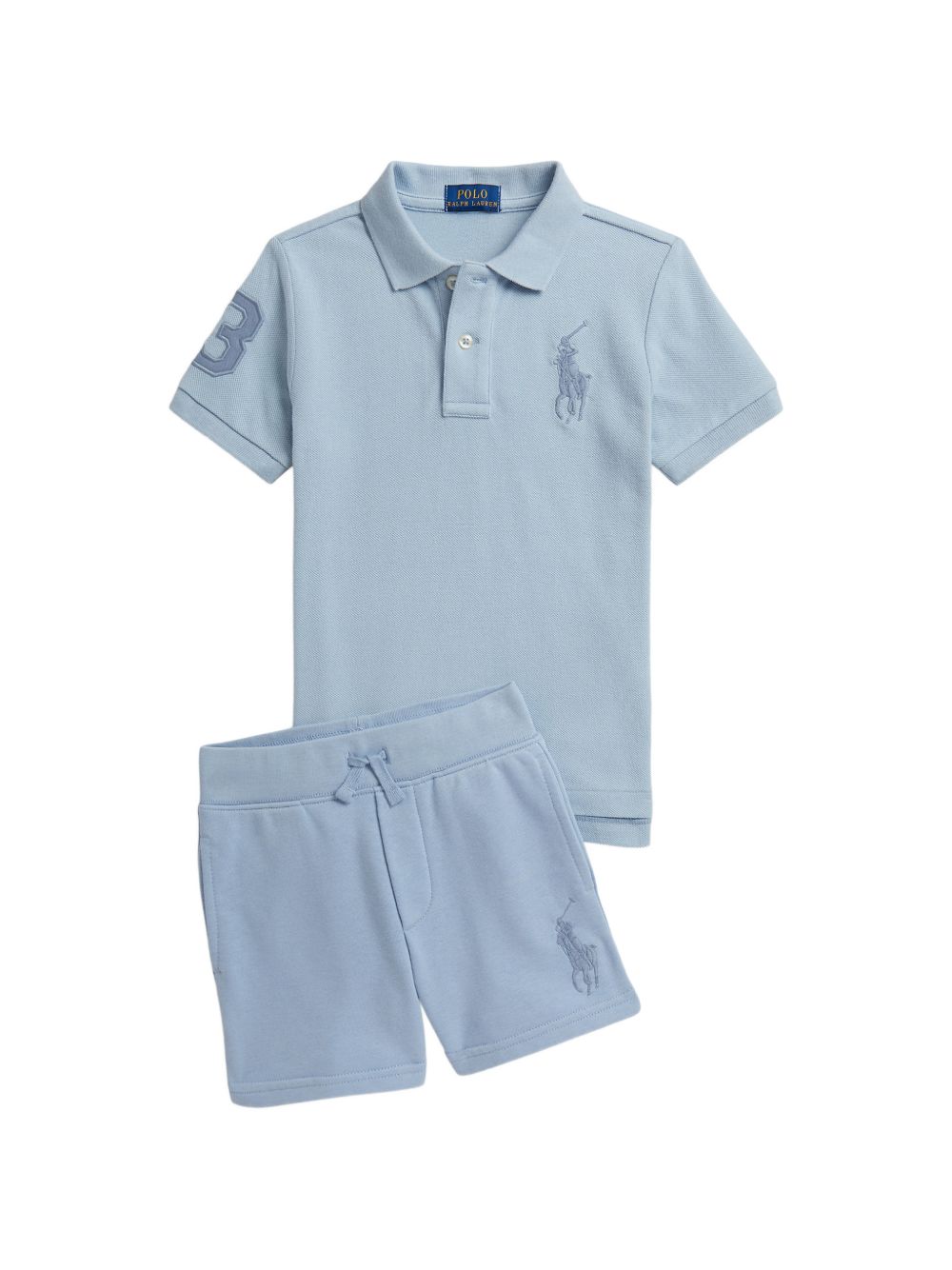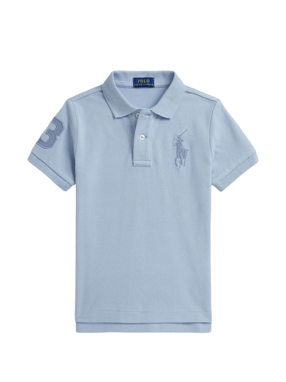 Polo con logo ricamato, azzurro, colletto polo a coste, pattina a due bottoni, maniche corte, giromanica a coste, applicazione in twill.