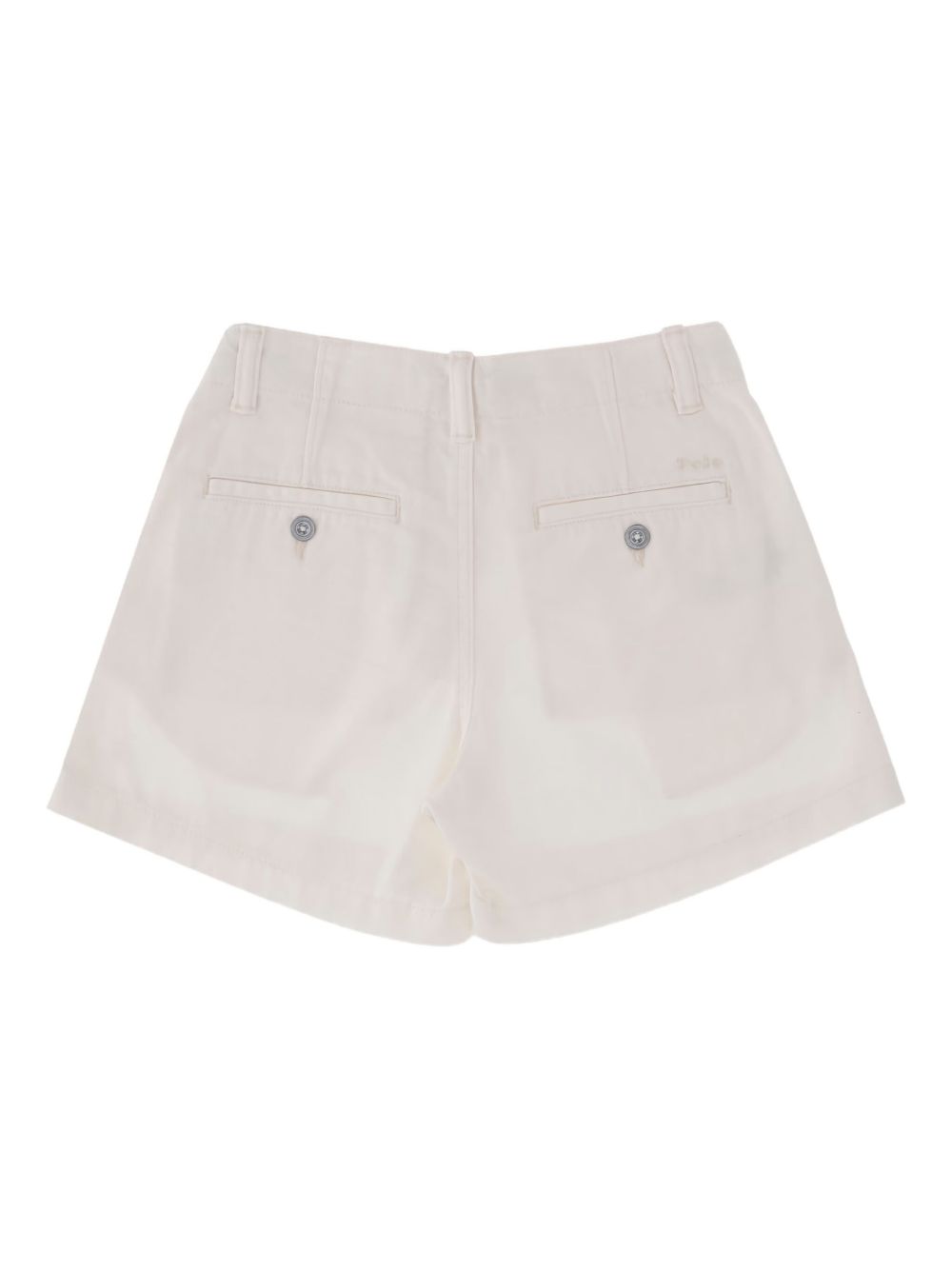 Shorts bianco, chiusura frontale con bottoni e zip, passanti, due tasche oblique, due tasche a filetto posteriori con bottone.