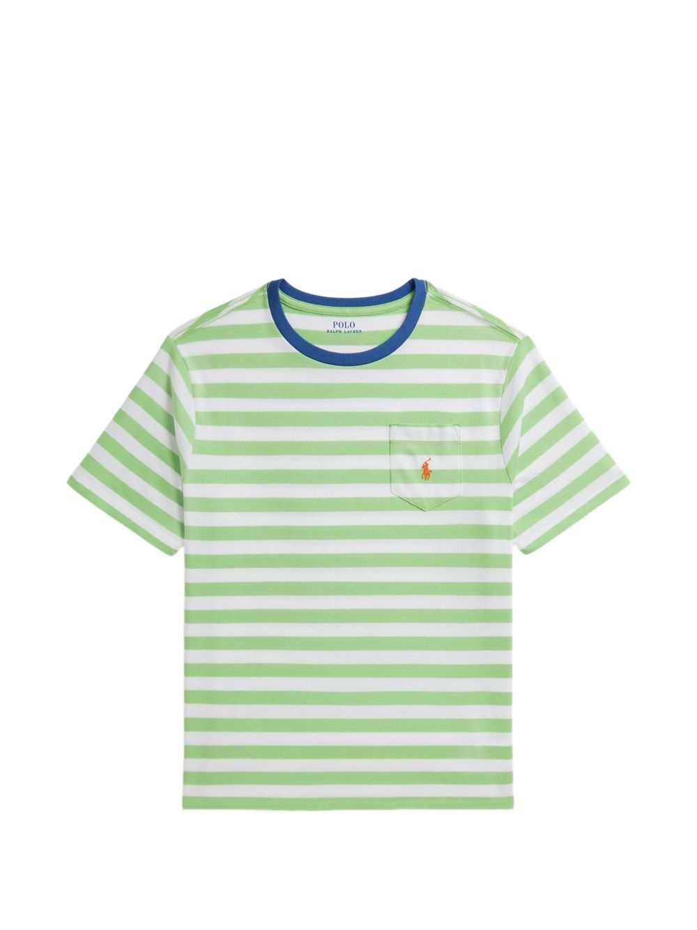 girocollo a righe verdi/bianche in cotone con taschino sul petto