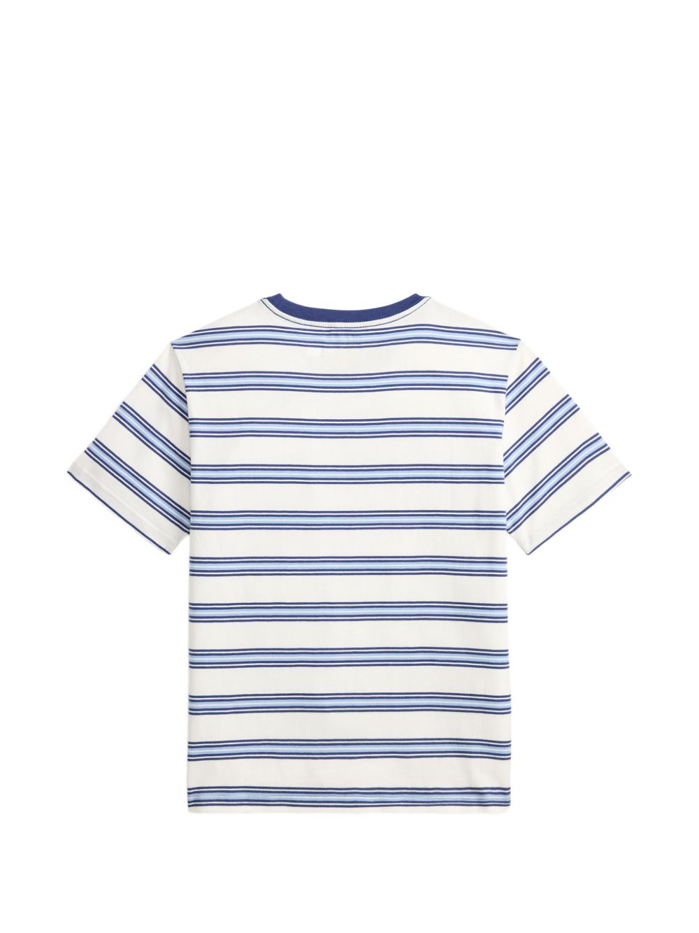 T-shirt a righe bianche e blu ricamate, girocollo, maniche corte.