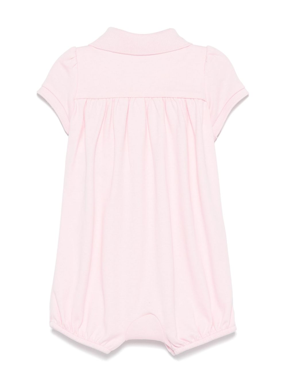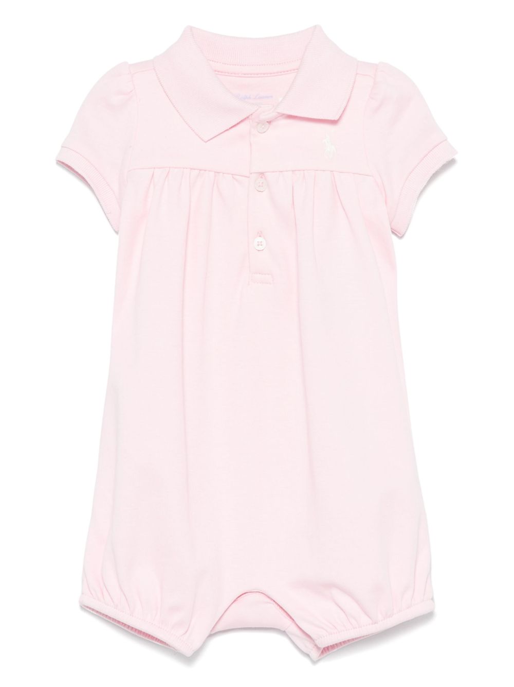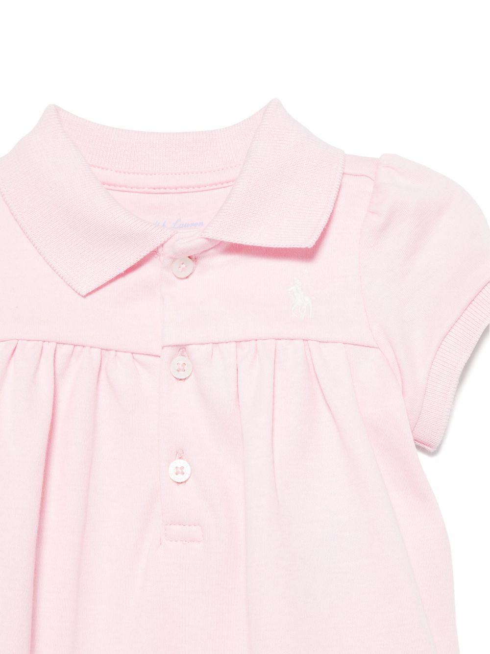 Tutina rosa chiaro, chiusura frontale con bottoni, chiusura con abbottonatura a pressione, colletto classico, maniche corte.