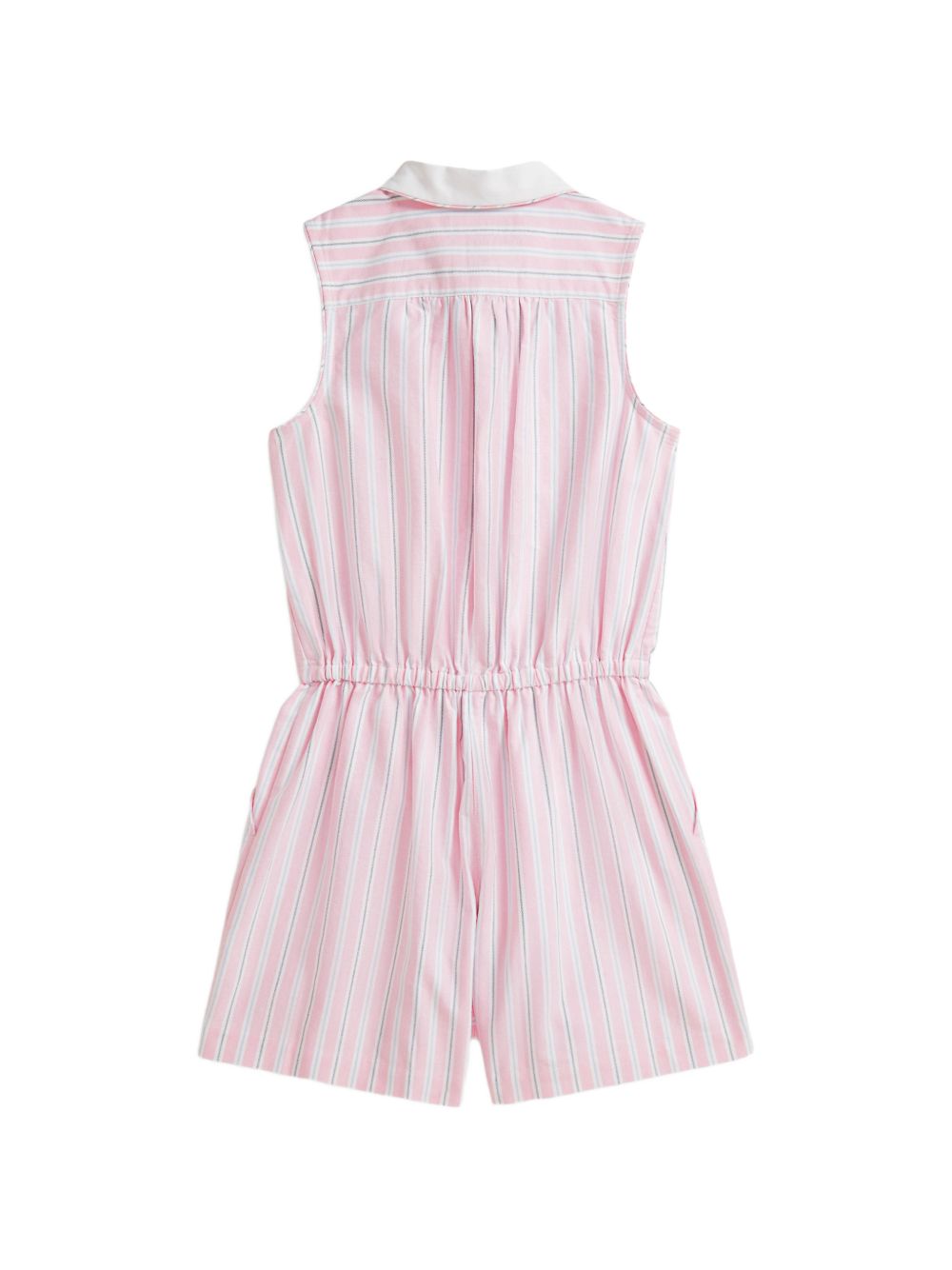 Tutina rosa, motivo a righr, colletto a punta, chiusura a bttoni, vita con coulisse, senza maniche.
