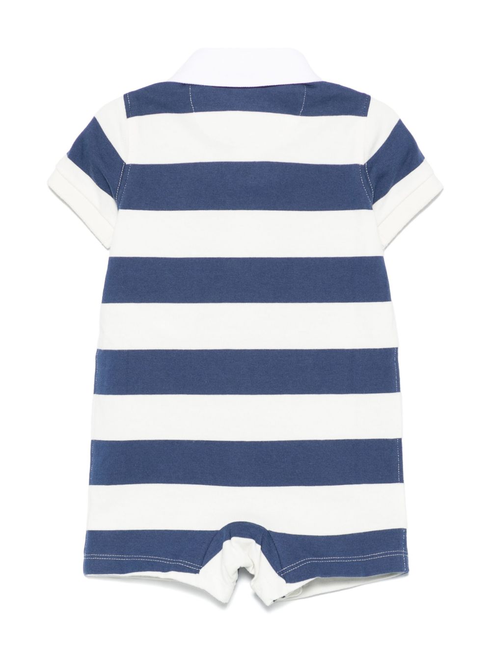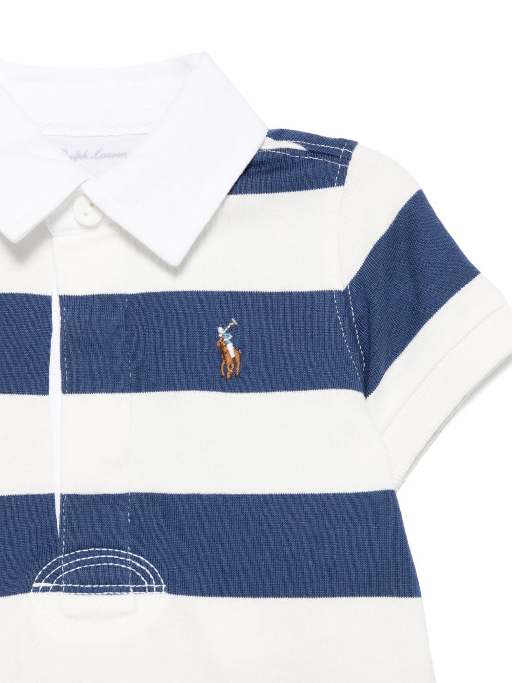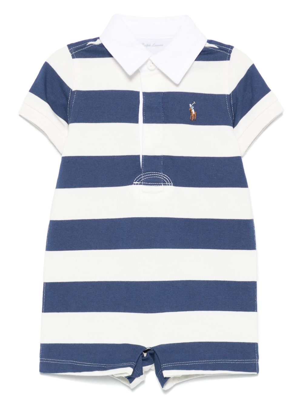 Tutina a righe blubianco , logo ricamato, maniche corte, colletto stile polo , chiusura con bottoni a pressione.