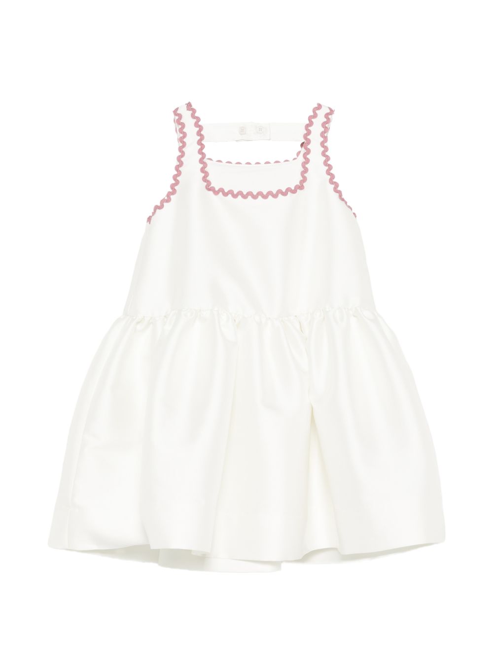 Abito bianco, con ruches, senza maniche, girocollo, taglio svasato.