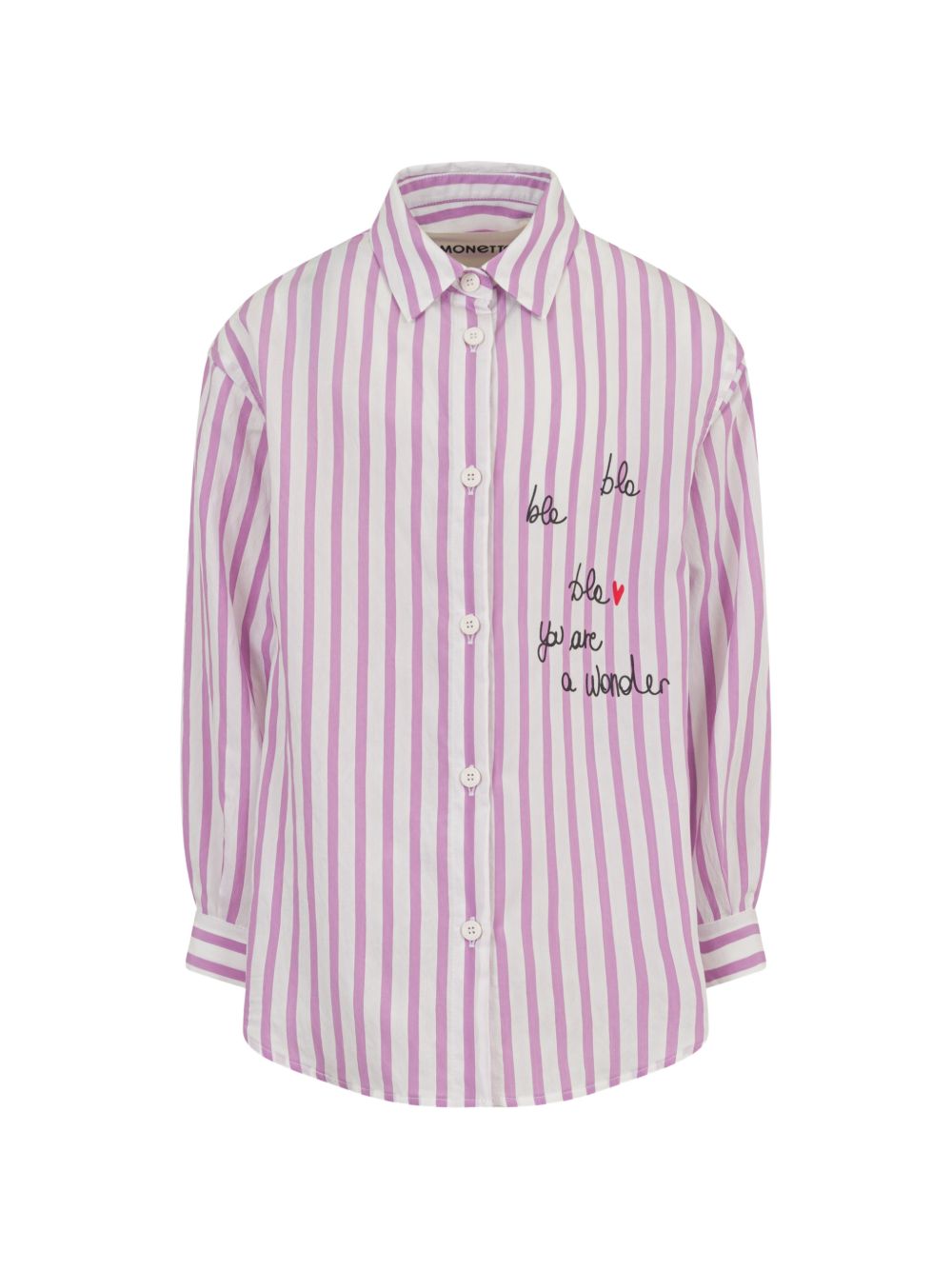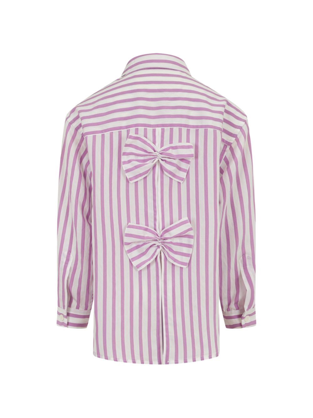Camicia lilla, motivo a righe, dettaglio fiocco, chiusura a bottoni, maniche lunghe, colletto a punta.