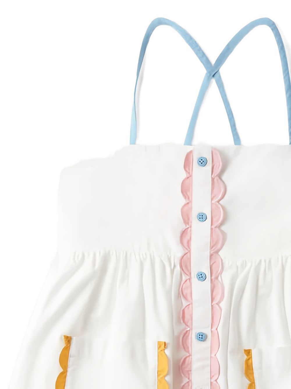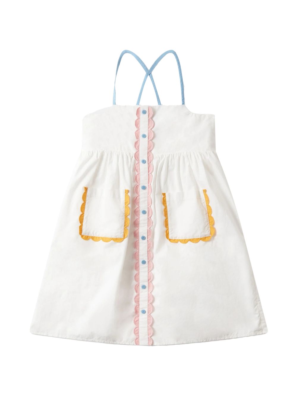 Abito con bordo a contrasto, bianco, tasche frontali, orlo a smerlo, chiusura a bottoni.