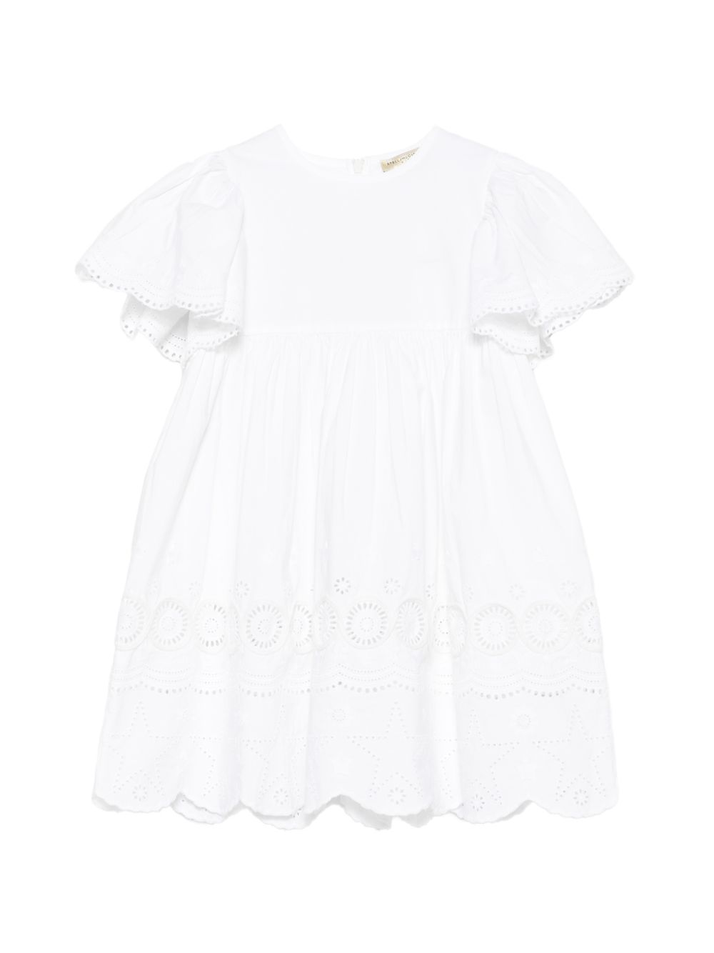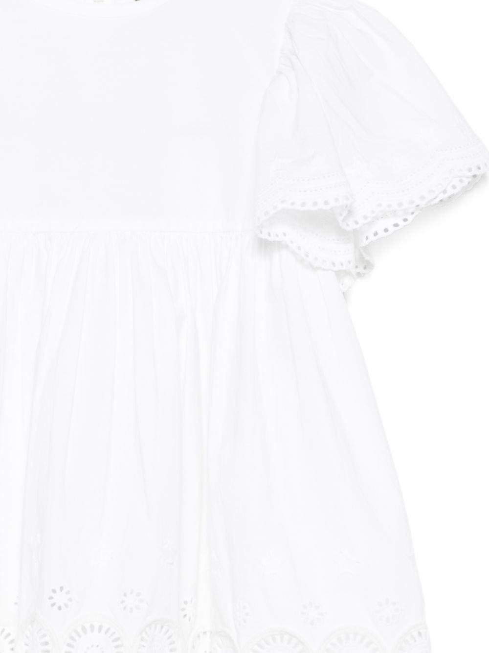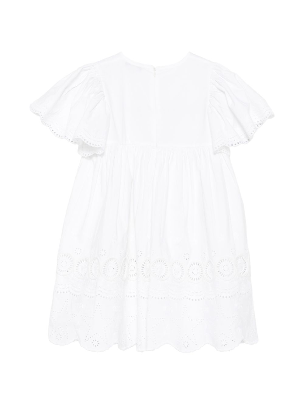 Abito con scollo rotondo in pizzo sangallo bianco, maniche corte a volant, orlo smerlato, chiusura posteriore con zip.