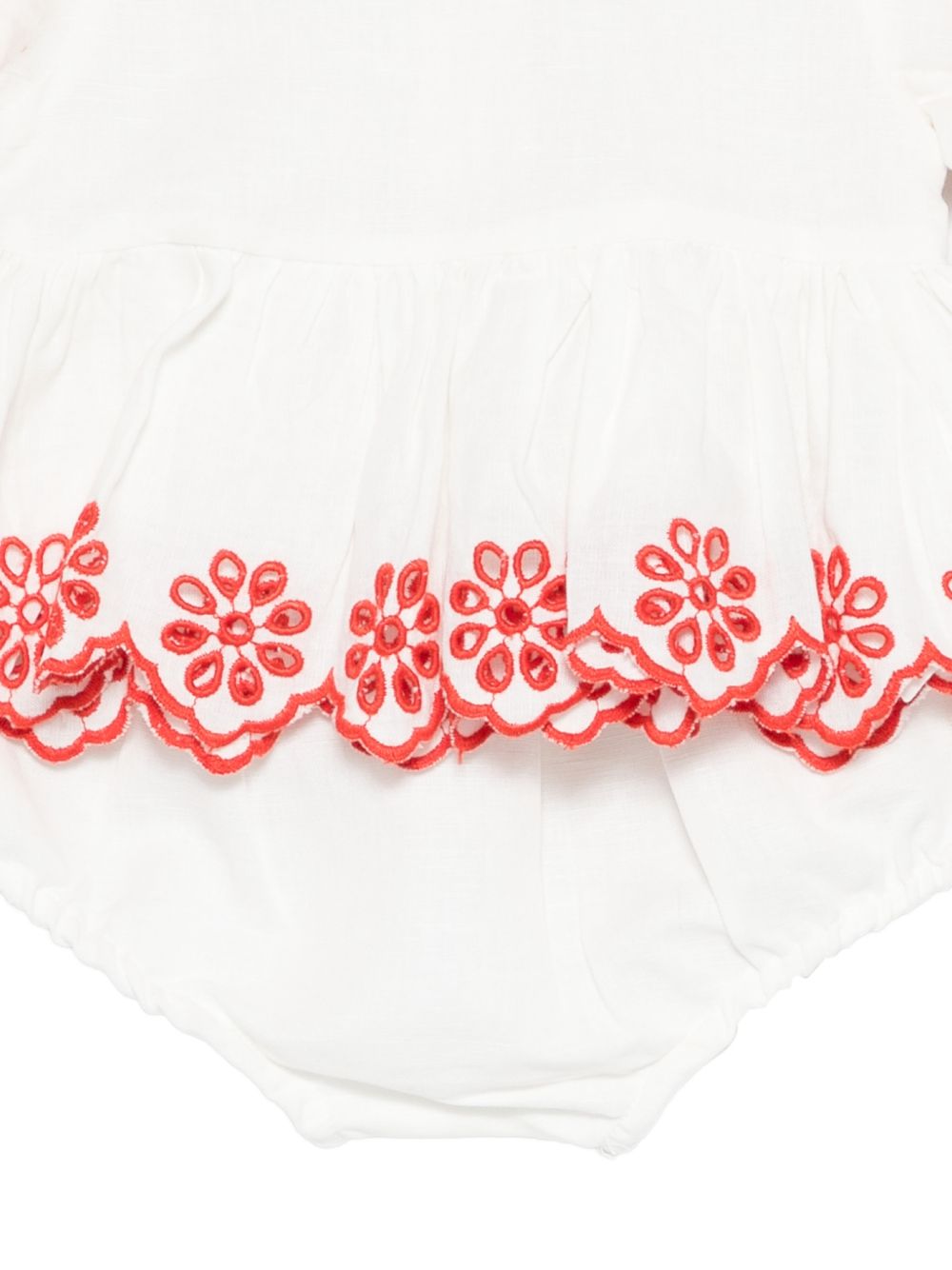Baby set con volant bianco, maniche corte, scollo rotondo, orlo elasticizzato, include coulette.