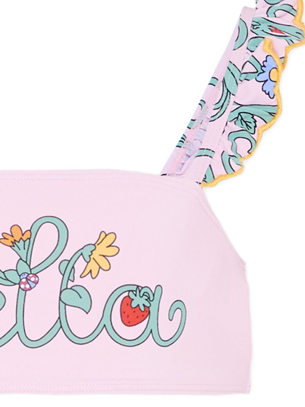 Bikini con stampa a fiori, rosa, dettagli con ruches, stampa con logo.