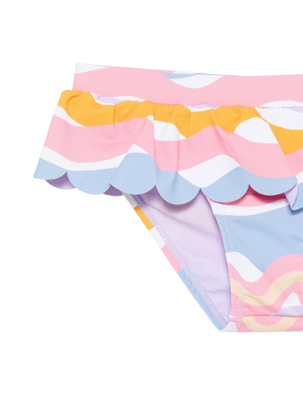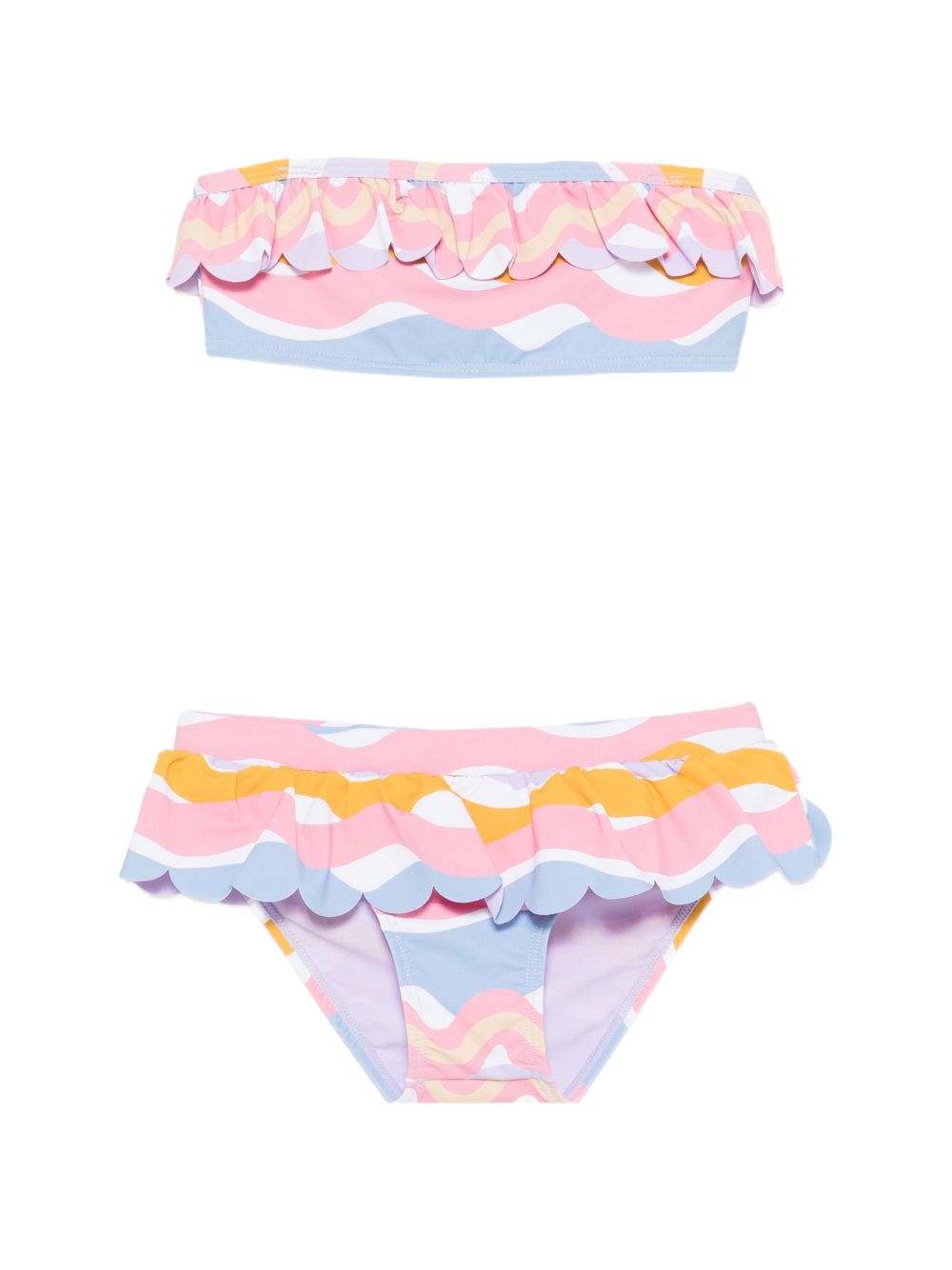 Bikini rosa/blu con spalline sottili e bordi arricciati.