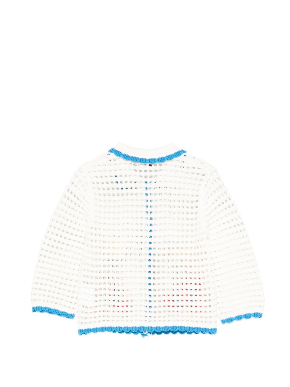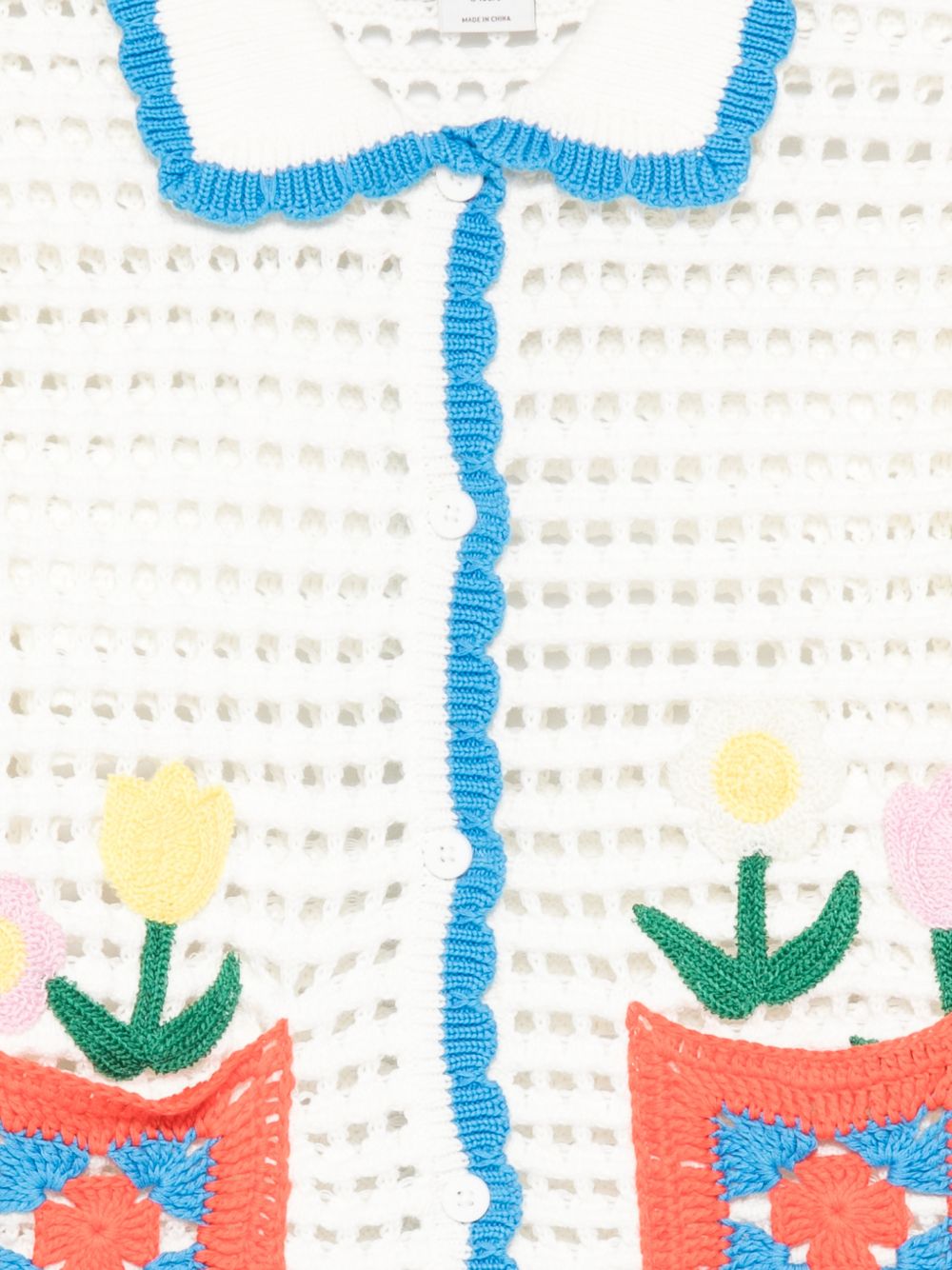 Maglione con applicazione floreale,bianco, chiusura con bottoni, rifiniture smerlate, maglia aperta.